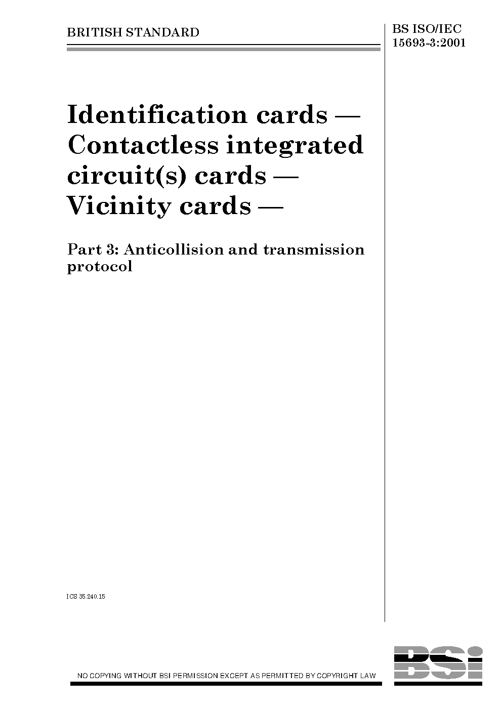 Cards and security devices for personal identification. Contactless vicinity objects Anticollision transmission protocol