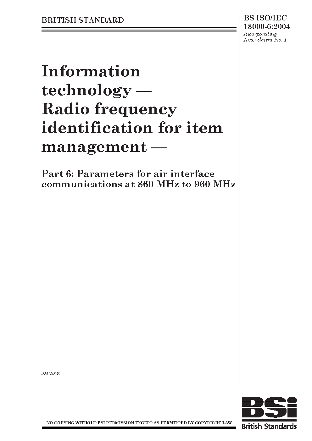 Information technology. Radio frequency identification for item management Parameters air interface communications at 860 MHz to 960