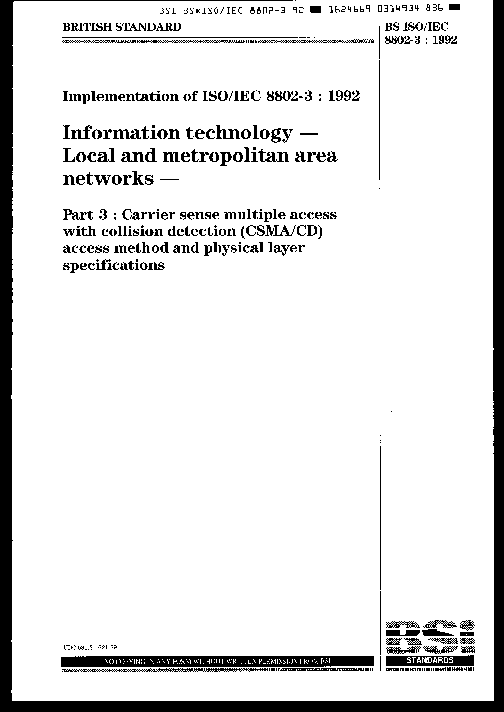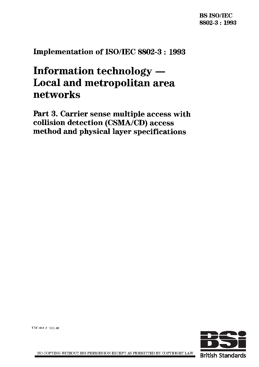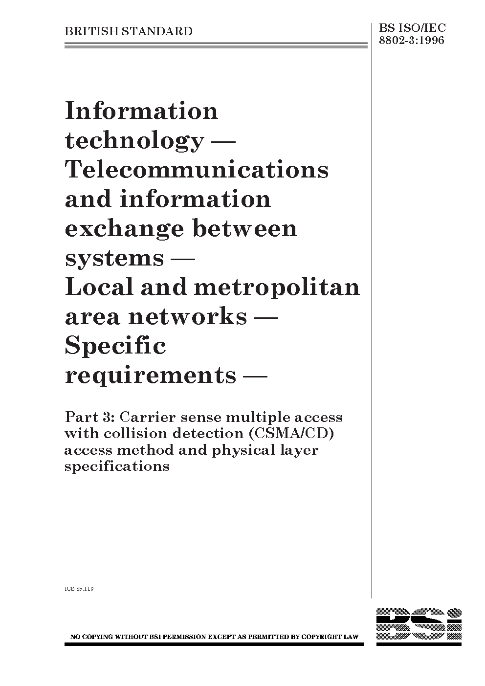 Information technology. Local and metropolitan area networks. Carrier sense multiple access with collision detection (CSMA/CD) method physical layer specifications