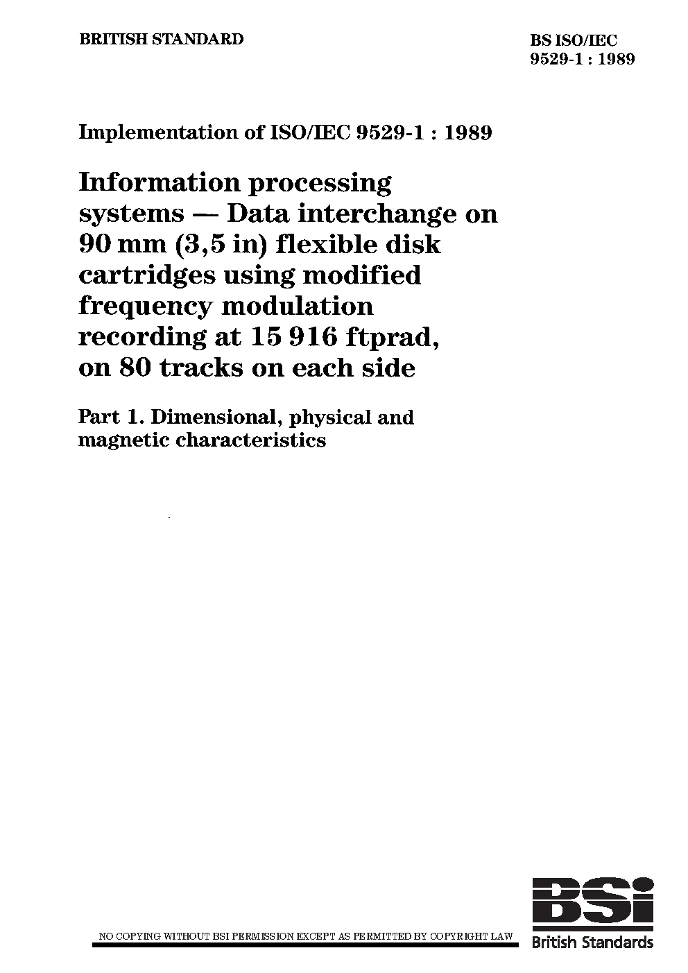 Information processing systems. Data interchange on 90 mm (3,5 in) flexible disk cartridges using modified frequency modulationrecording at 15916 ftprad, 80 tracks each side Dimensional, physical and magnetic characteristics