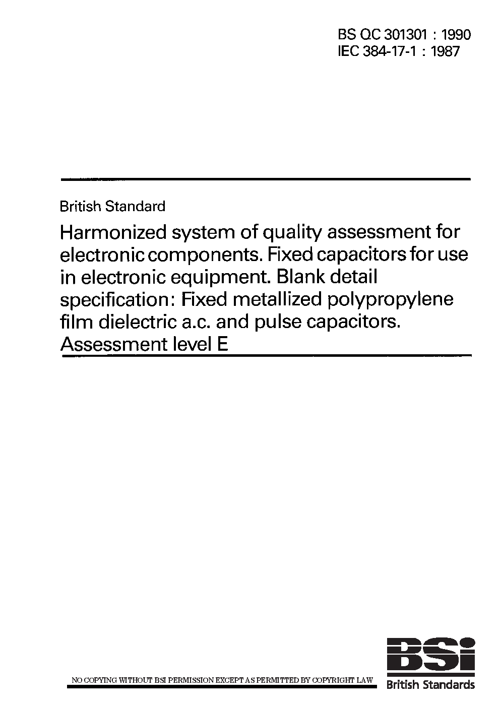 Harmonized system of quality assessment for electronic components. Fixed capacitors for use in electronic equipment. Blank detail specification: fixed metallized polypropylene film dielectric a.c. and pulse capacitors. Assessment level E