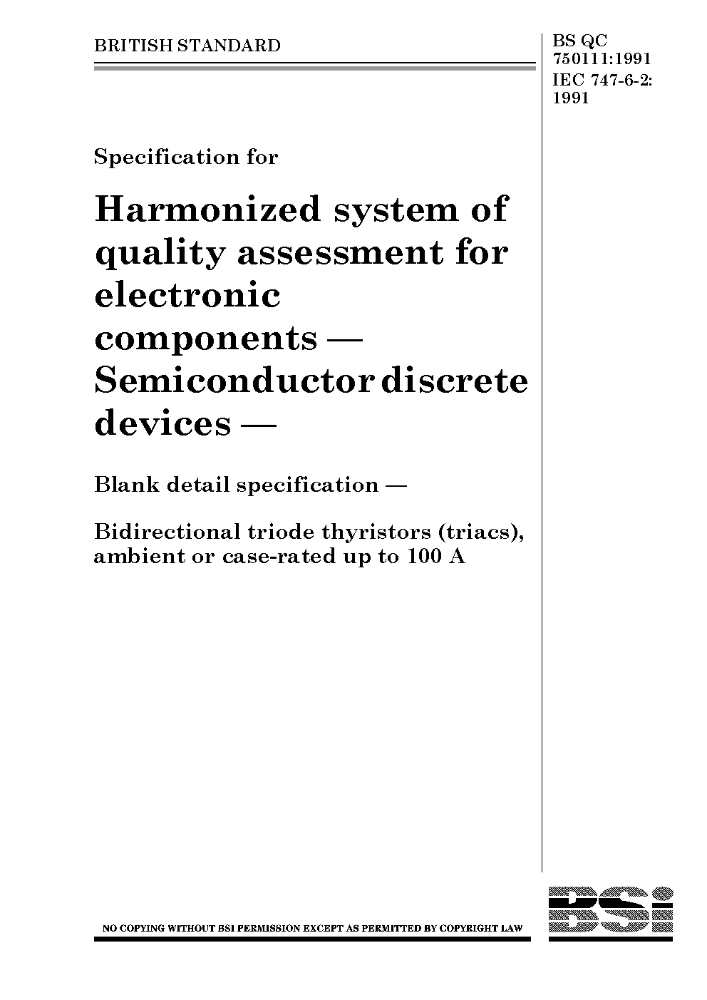 Specification for harmonized system of quality assessment for electronic components. Semiconductor discrete devices. Blank detail specification. Bidirectional triode thyristors (triacs), ambient or case-rated, up to 100 A