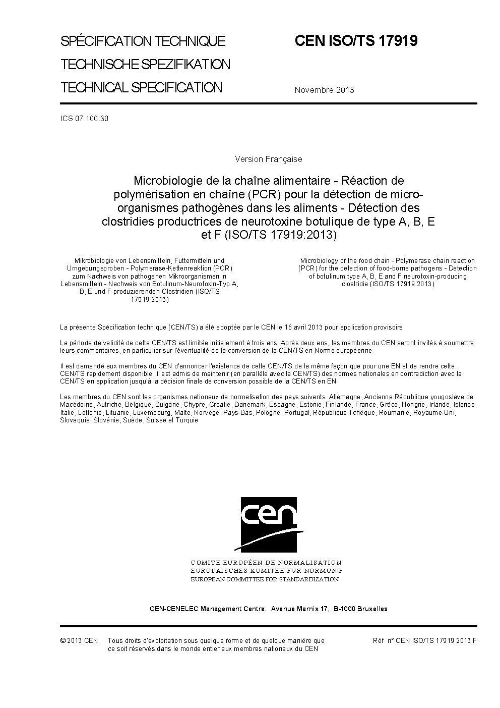 Microbiology of the food chain - Polymerase chain reaction (PCR) for the detection of food-borne pathogens - Detection of botulinum type A, B, E and F neurotoxin-producing clostridia (ISO/TS 17919:2013)