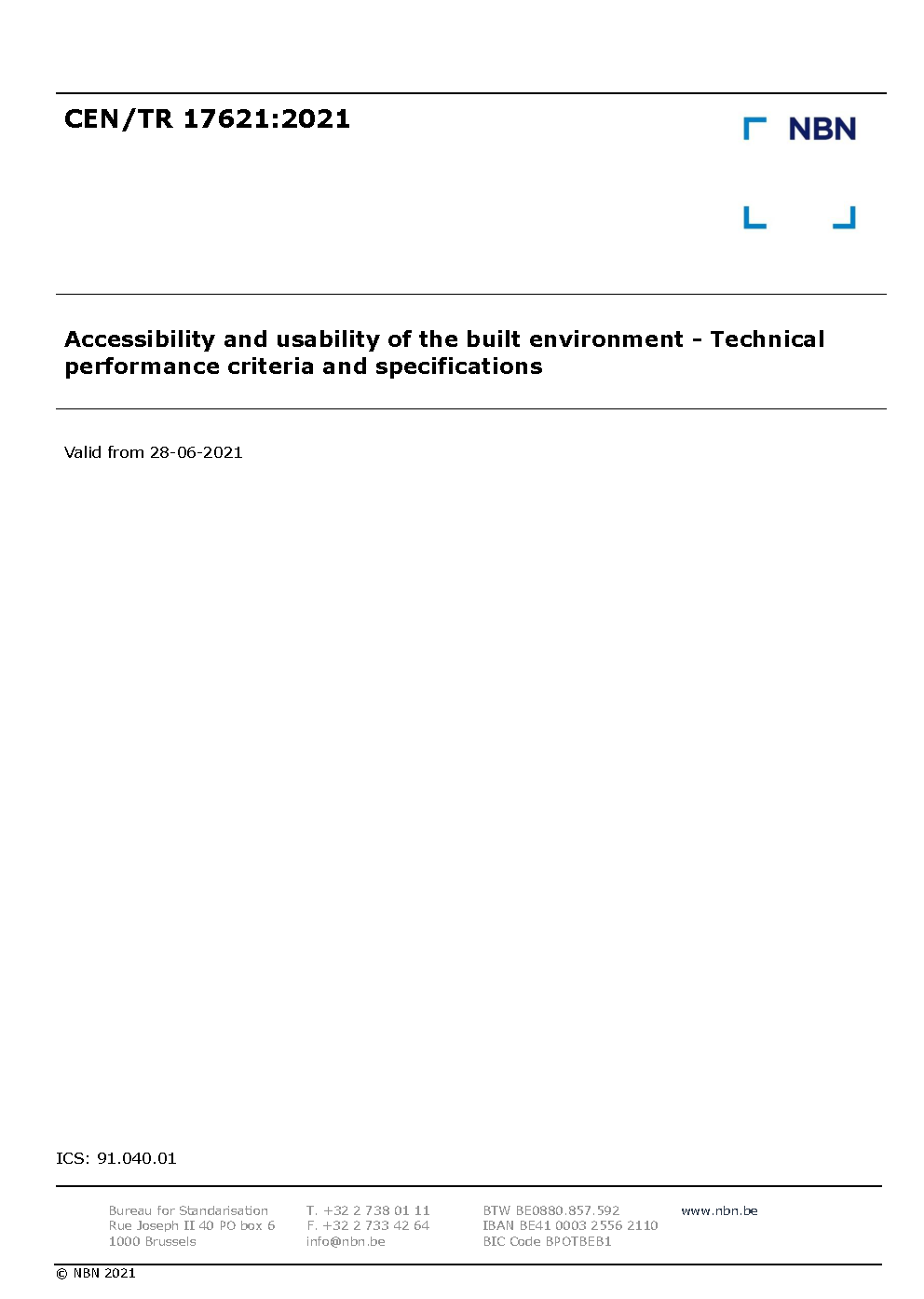This document has been developed to support EN 17210, “Accessibility and usability of the built environment – Functional requirements”. This document provides and exemplifies technical performance criteria and specifications for an accessible and usable built environment, following the Design for All/Universal design principles. The document specifies what is necessary to align with these principles which will facilitate equitable and safe use for a wide range of users.