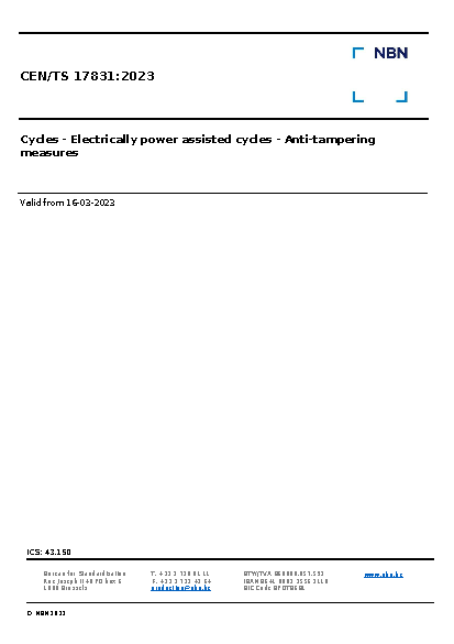 This document is intended to cover anti-tampering requirements of EN 15194:2017, 4.2.17. It provides reproducible test methods recognized by the market aiming at protecting safety and fighting tampering of electric power assisted cycles.