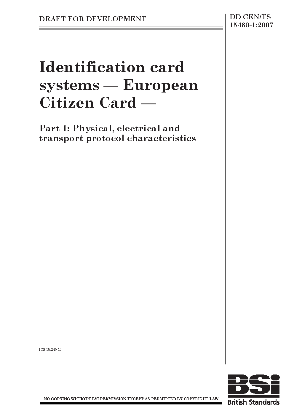 Identification card systems. European Citizen Card Physical, electrical and transport protocol characteristics