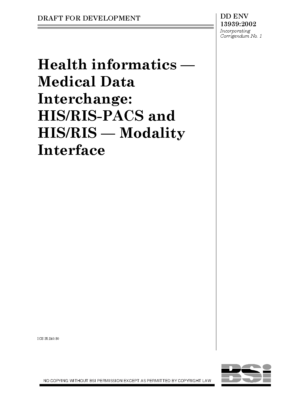 Health informatics. Medical data interchange: HIS/RIS-PACS and HIS/RIS. Modality interface