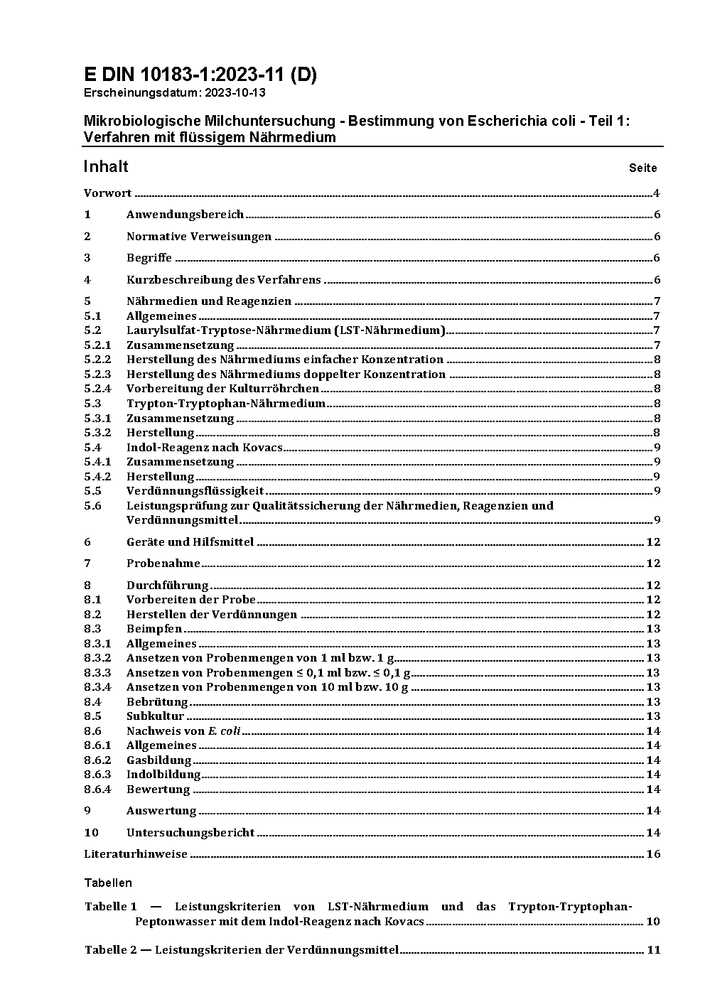 The standard specifies a method for the enumeration of Escherichia coli applicable to milk and milk products. Cultivation in a liquid selective medium. Calculation of the number of E.coli with the MPN-method per ml or g of sample after confirmation of the grown colonies.