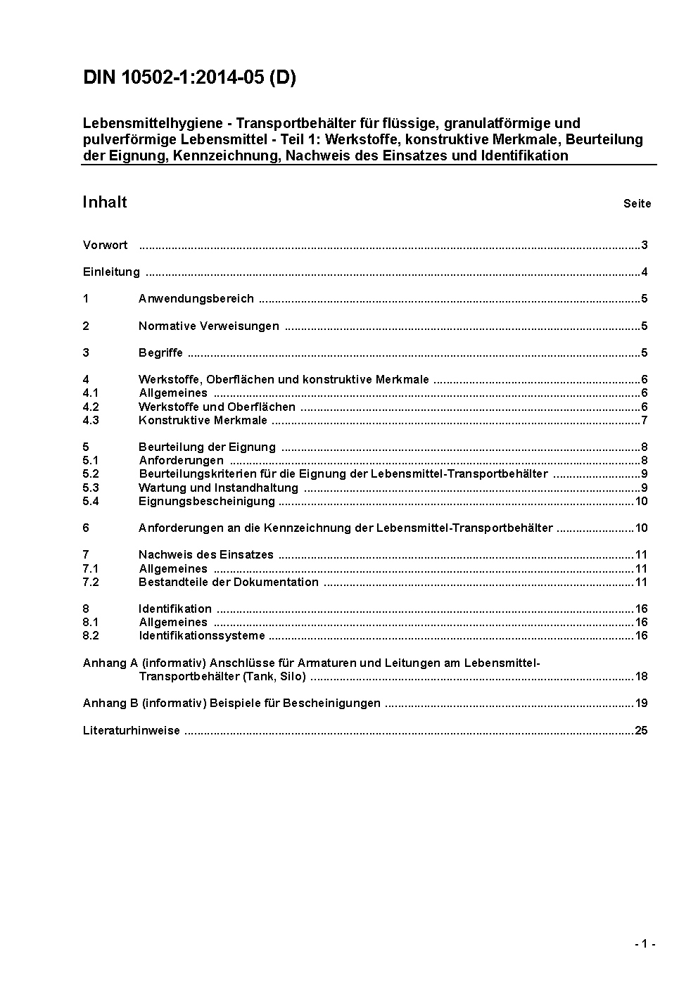 Food hygiene - Containers for liquid, granulated and powdered foodstuffs - Part 1: Materials and constructive features, evaluation of suitability, marking, proof of application and identification