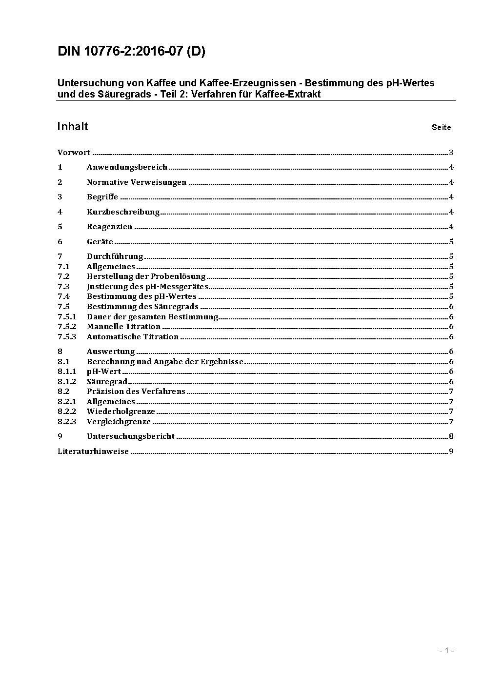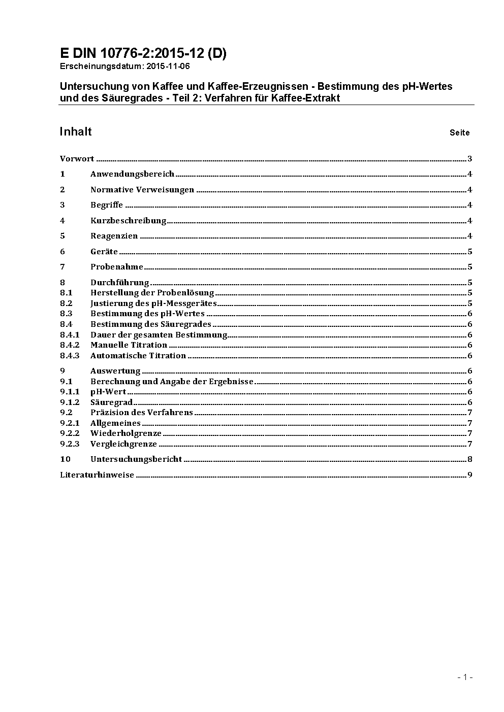 The document specifies a method for the determination of pH and acid content. It is applicable to soluble coffee with coffein and to soluble coffee free from coffein. For the determination of the pH measure the potential difference between a glass and a reference electrode in a solution of water-extract.