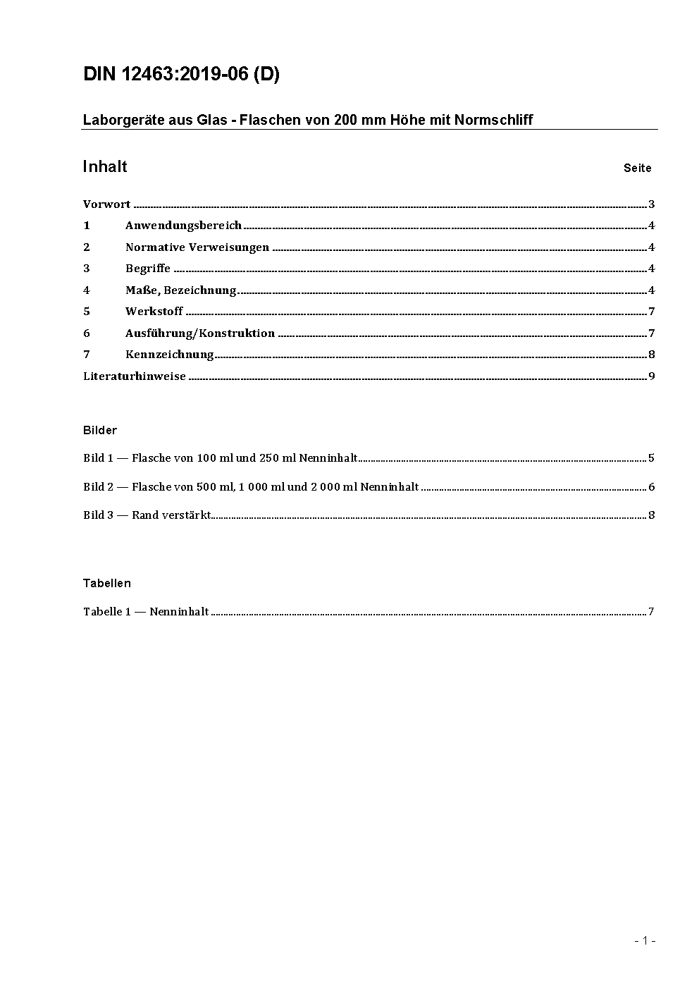 This standard specifies requirements for 200 mm bottles with standard ground joint with a nominal capacity of 100 ml, 250 ml, 500 ml, 1000 ml and 2000 ml for use in laboratories. This standard is intended to ensure that bottles with different nominal contents are to be used as interchangeable subparts of laboratory equipment. By defining a uniform height, they can be combined with various standard grinding machines beyond the given application examples, without the need for special designs for each bottle size. NOTE Bottles with a nominal capacity of 100 ml to 500 ml are preferably used for gas washing bottles. Bottles with a nominal capacity of 1000 ml and 2000 ml are preferably used for burettes with automatic zero adjustment and for filling pipettes.