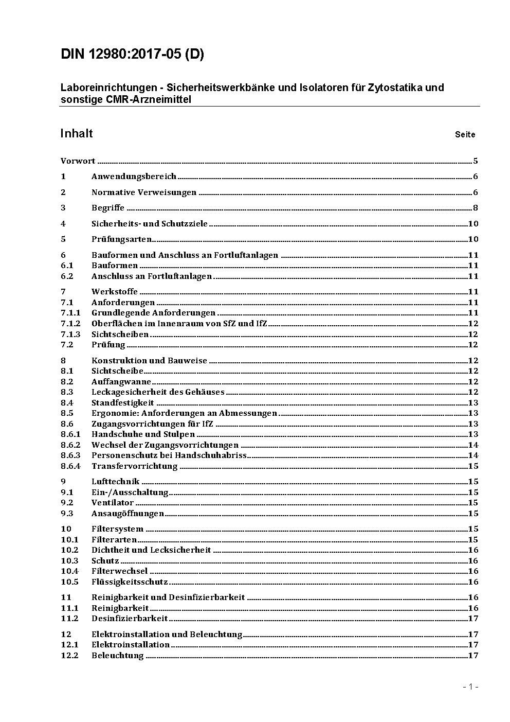 The standard specifies safety requirements and testing of cabinets for handling cytostatic drugs and other CMR drugs. The cabinets are used in hospitals, pharmacies and pharmaceutical industry laboratories for the preparation of cytostatics before use. Safety for the handled product as well as for the handling personal has to be guaranteed. The standard describes the necessary product requirements and is targeted to manufacturers and users of the cabinets as well as to test houses.