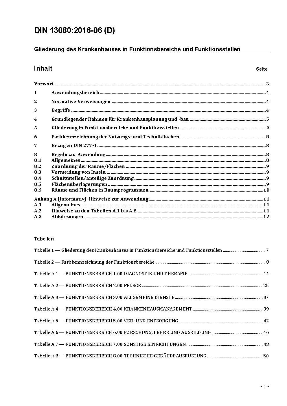 This standard sets out requirements for planning the construction of hospitals as well as their evaluation and assessment. It applies to hospitals and university clinics as well as to comparable healthcare facilities. It provides a basis for facilitating understanding between all parties involved in planning. DIN 13080 provides a basis for arranging the utilization areas and technical operating areas of hospitals. It applies to all types of hospital organization and specialized hospital units. This standard defines utilization areas and technical operating areas and their arrangement on the basis of the functions specific to hospitals. The calculation of the areas is dealt with in DIN 277-1.