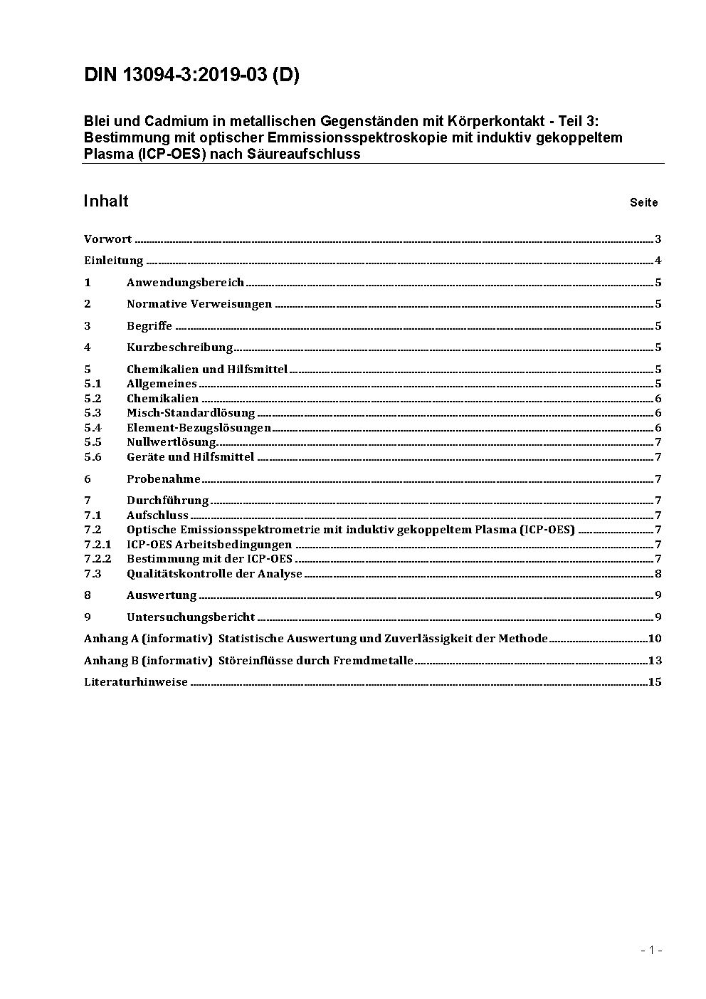 Blei und Cadmium in metallischen Gegenständen mit Körperkontakt - Teil 3: Bestimmung mit optischer Emmissionsspektroskopie mit induktiv gekoppeltem Plasma (ICP-OES) nach Säureaufschluss