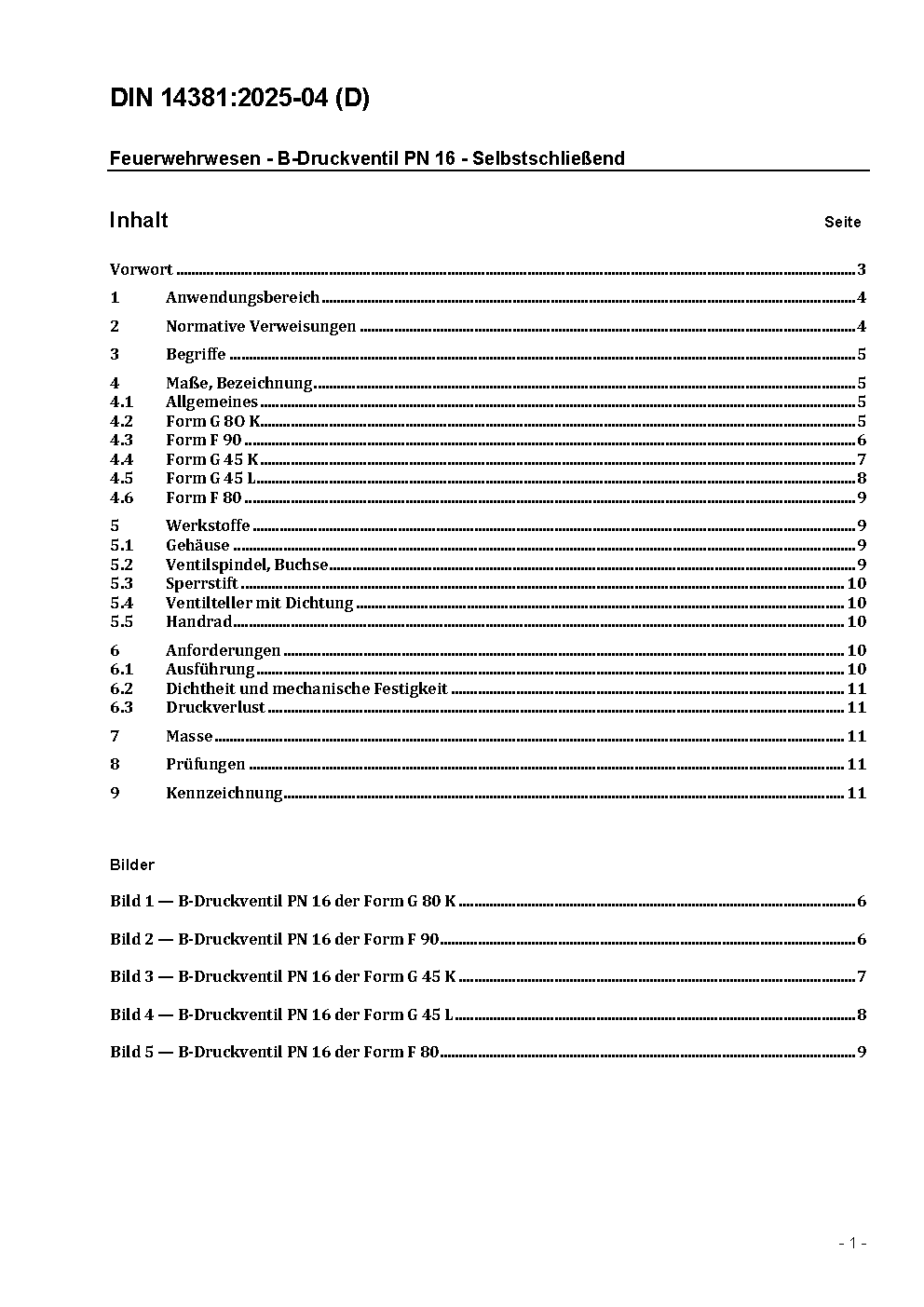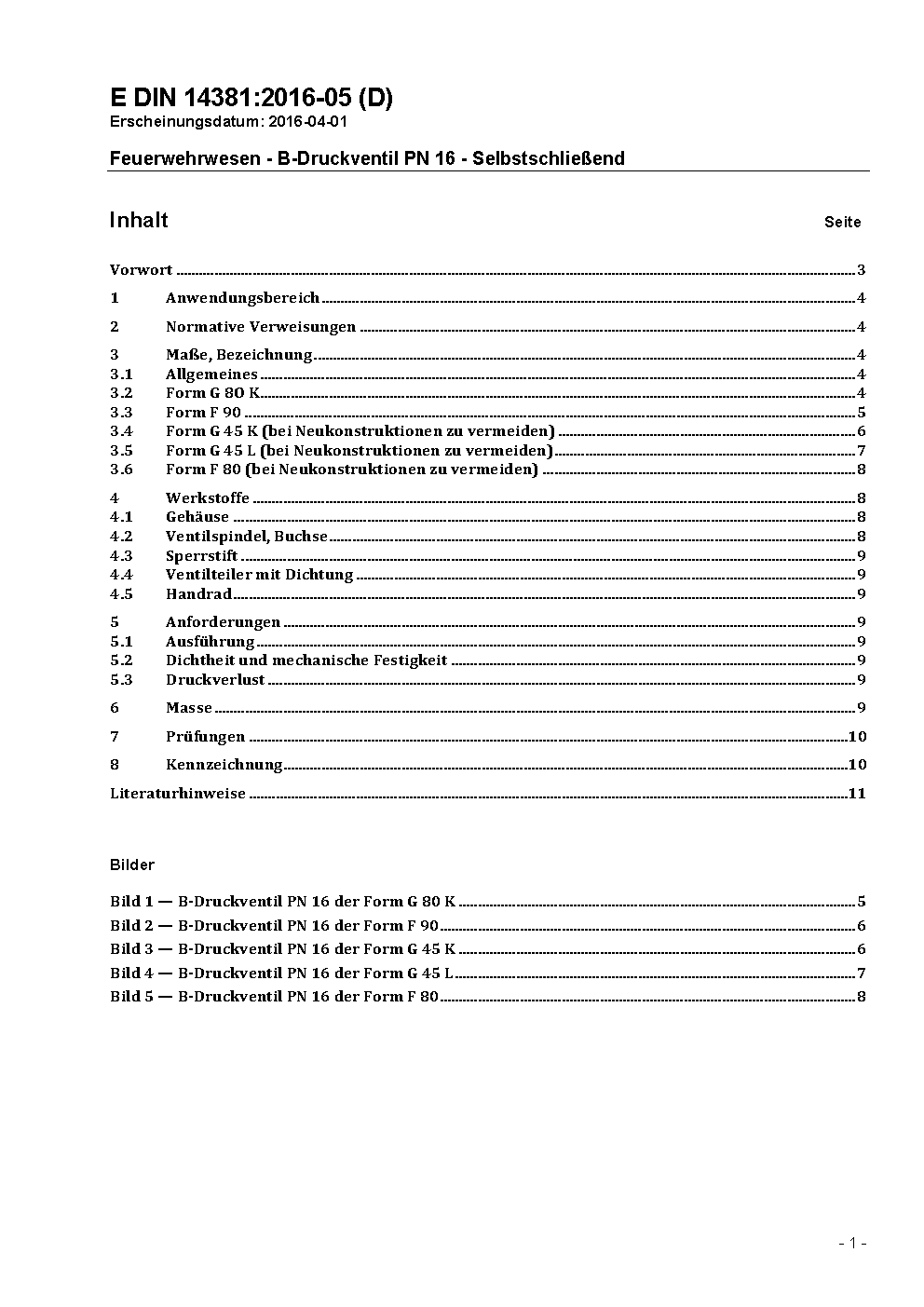The document contains dimensions, requirements and methods of test for pressure valves typ B with a nominal pressure of 16 bar of fire fighting pumps.