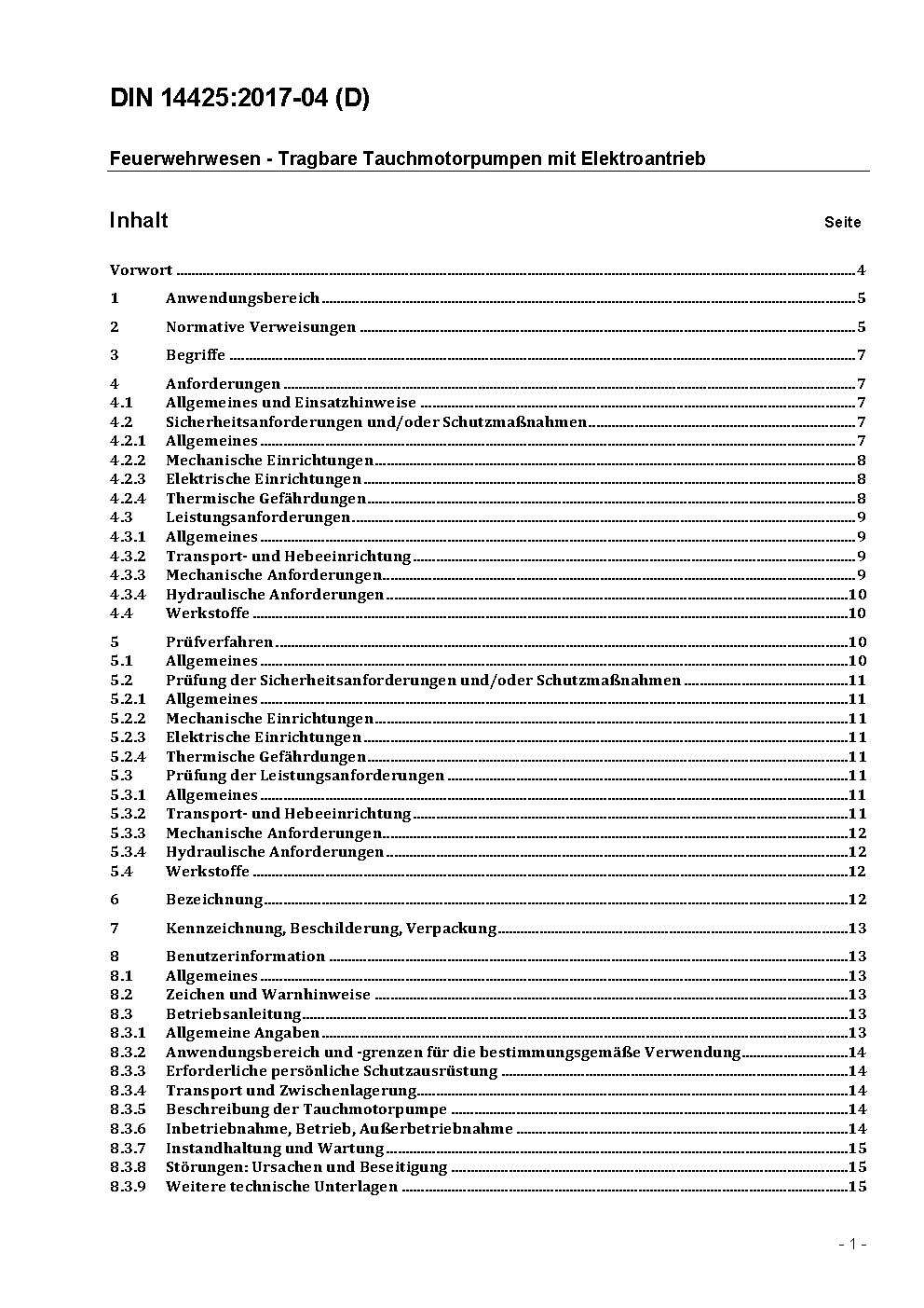 The document contains requirements and tests for portable submersible pumps with electrical motor. The submersible pumps are fire-brigade pumps and mostly serve for pumping water out.