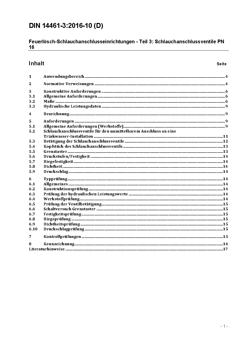 This Standard specifies requirements for hose valves which connect the water supply to the water pipe wet and wet/dry, especially for hose systems: - size 1: for hose systems according to DIN 14461-1,Type S (self help) - size 2: for hse systems according to DIN 14461-1, Type F (fire brigade), and according to 14461-6. - size 2 1/2 for special purposes. The components are used in pipes according to DIN 14463-1.