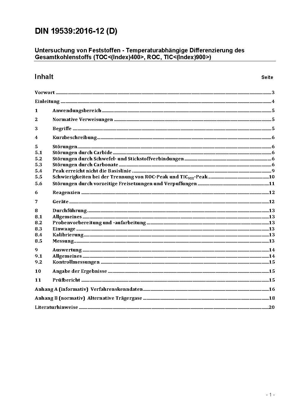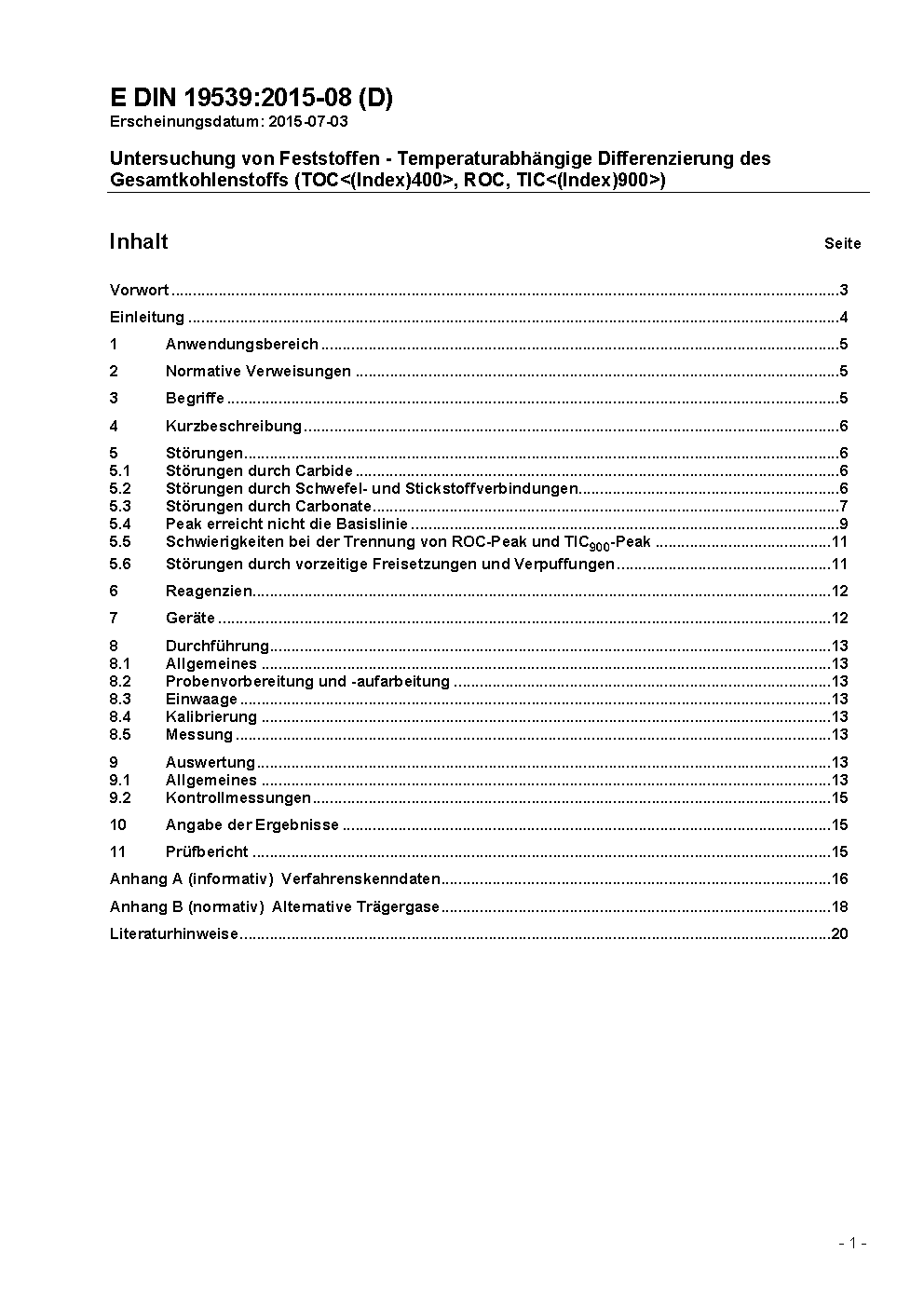 This draft standard defines a method for the determination of organic carbon, which is released up to 400° C (TOC400), residual oxidizable carbon (ROC) (like soft coal, hard coal, wood charcoal, diesel exhaust particulates) and inorganic carbon, which is released up to 900° C (TIC900). The basis is dry combustion under stream of oxygen to CO2 using temperature gradients from 150 °C to 900 °C of dry solid samples of soil, soil mixed with man-made substrates and certain wastes with more than 1 g carbon per kg (0,1 %) (per carbon type contained in the sample). The method is applicable to dry samples of soil, soil mixed with man-made substrates and certain wastes (ash from burning of household waste, slag from burning processes, foundry sand) with more than 1 g carbon per kg (0,1 %) (per carbon type contained in the sample).