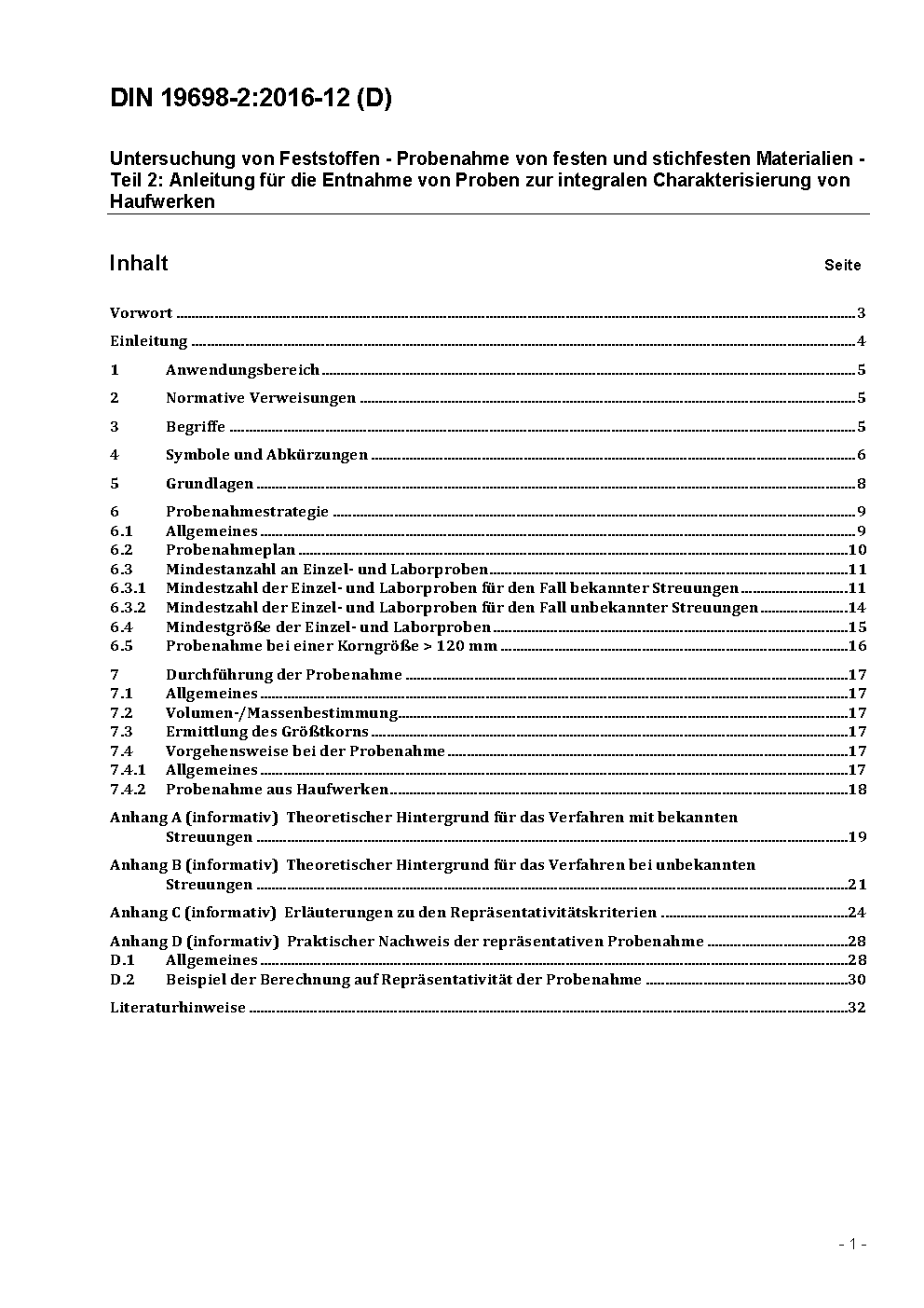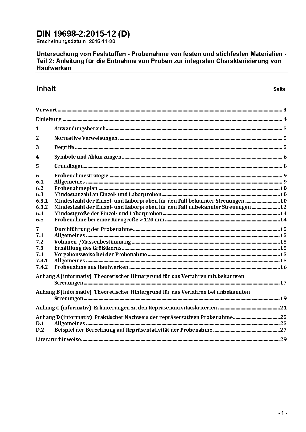 The Draft Standard DIN 19698-2 is foreseen to establish mandatory regulations for taking samples for the unified approach at physical, chemical and biological investigations in connection with the reuse or disposal of waste. The investigation of the samples and the evaluation of the results are excluded. The typical composition of solid waste in grain size or monolithic size and material constituent/content varies from homogeneous to extremely heterogeneous. The determination of the characteristics of a substance can therefore only be reliably approximated by taking a statistically sound number of samples, depending on primarily the volume of the stockpile. Experience showes considerations (supposed saving of sampling and investigation costs) usually lead to an inadequate number of samples is obtained and examined. Therefore, the risks of misinterpretation and miscategorization might be disregarded, on the other hand it can lead to irreversible damages to the environment or to immense follow up costs due to a possibly unnecessary high requirement of disposals. Finally, it regards to the evaluation of the necessary levels of disposals and possibly the legal assessment of environmental offenses in this field.
