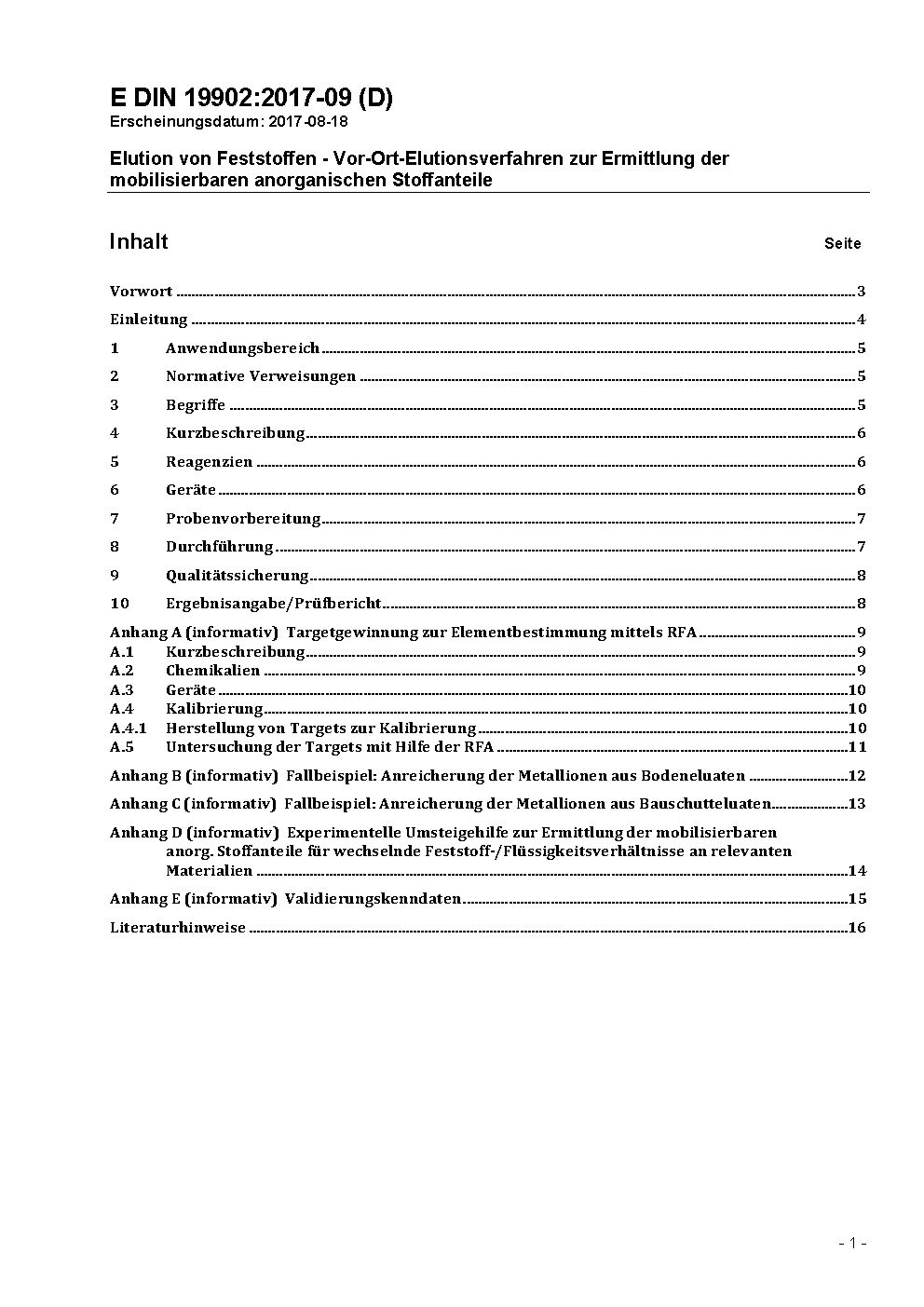 The method described in this standard serves for the determination of the release properties applying an on-site leaching test. In shortest space of time mobilizable inorganic fractions of the rapid leachate are available in a magnitude comparable to a leachate obtained due DIN EN 12457-4 with a liquid to solid ratio of 10 l/kg. This leaching method is not a replacement for DIN EN 12457-4. It serves for rapid determination of mobilizable inorganic fractions of the elements arsenic, lead, cadmium, chromium, copper, molybdenum, nickel, vanadium, tungsten and zinc.