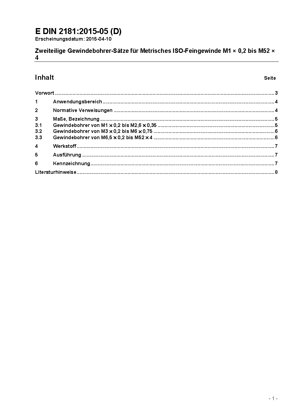 The document applies to sets of 2 taps consisting of taper taps (V) and bottoming taps (F) used for the manufacture of ISO metric fine threads according to DIN 13-2 to 9.