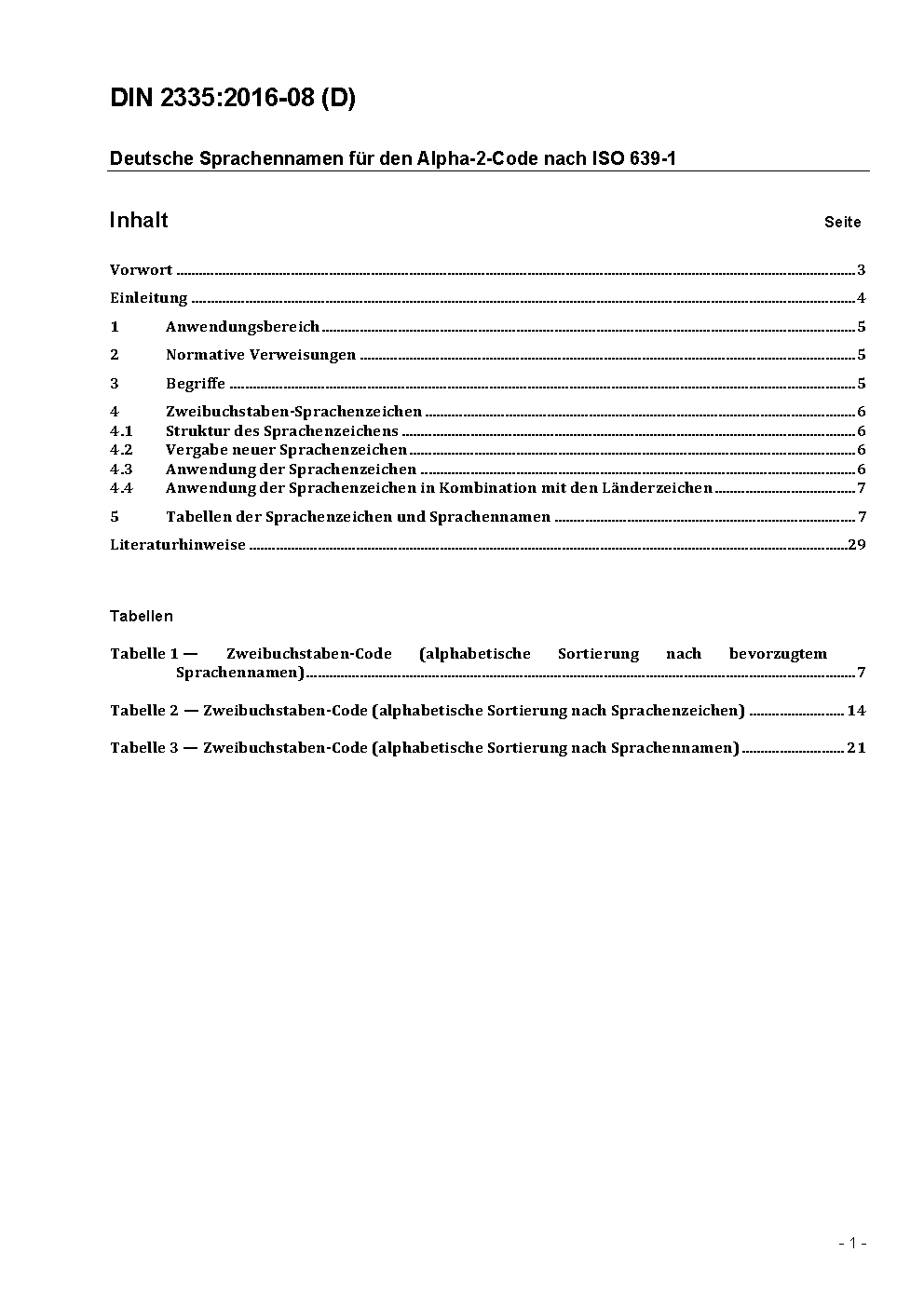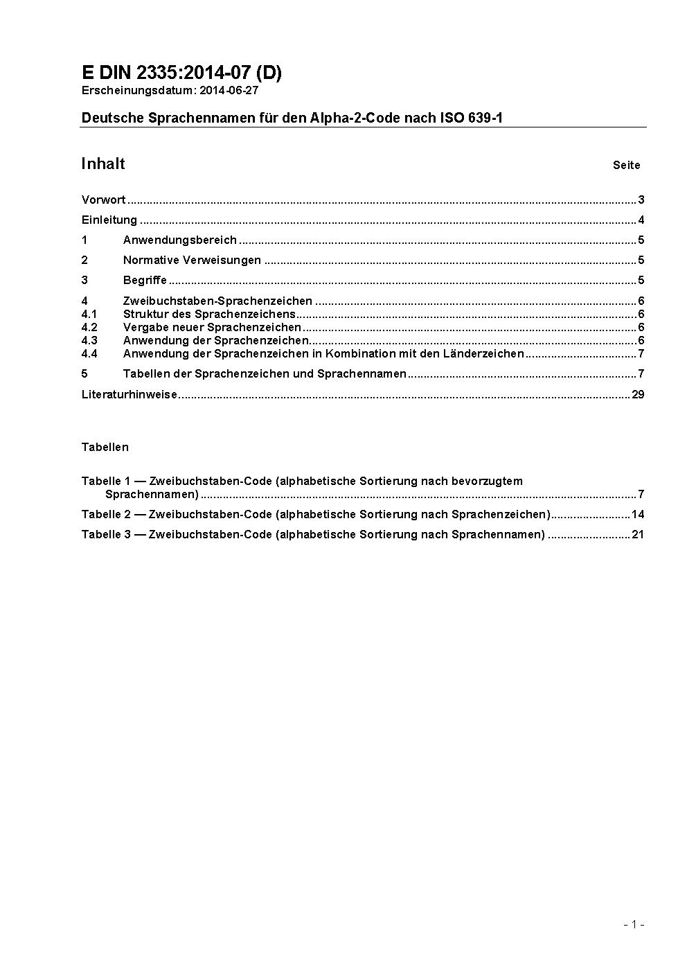 This standard serves for understanding in science and technology, business and administration, and is also applicable to other areas such as technology or, more specifically IT. DIN 2335 contains the two-letter language codes according to ISO 639-1 (in its updated database version 2012-12) and for each specifies a prefered version of the language name in German. The document lists also the most commonly used alternative language names and directs the user to the prefered language name. The criteria for the selection of the preferred language names are explained in the Foreword.