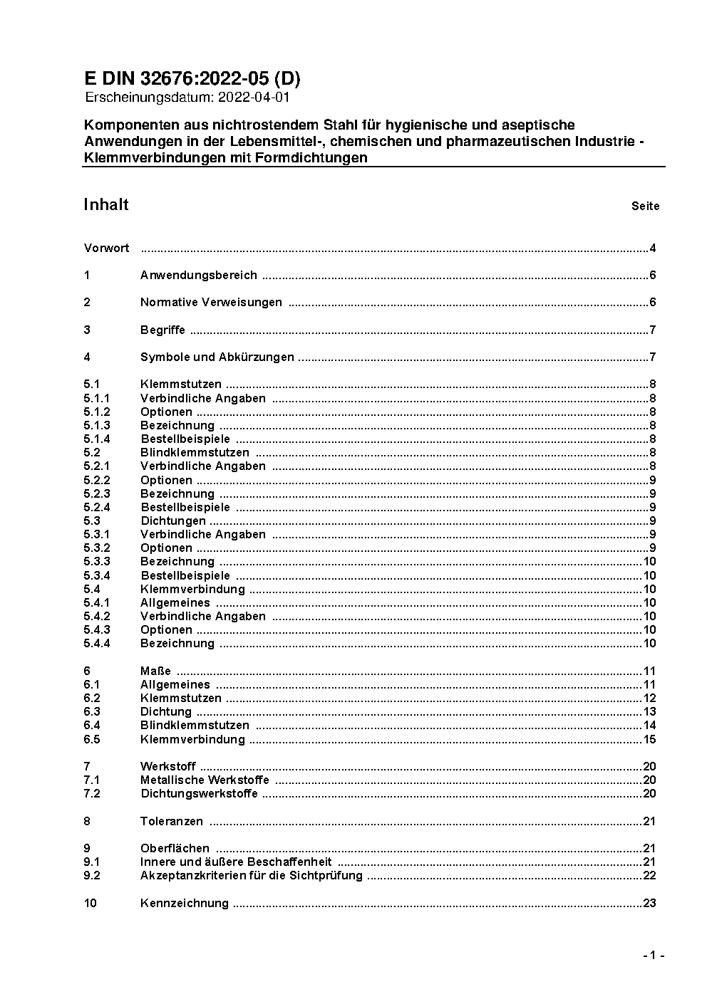 Armaturen für Lebensmittel; Klemmverbindungen für Rohre aus nichtrostenden Stählen