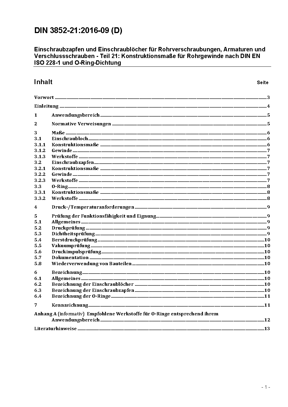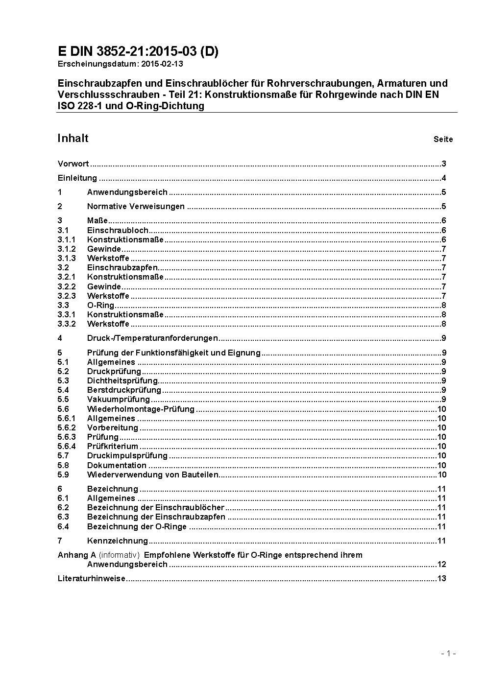 This standard applies for dimensions and designation of ports with pipe thread according to DIN EN ISO 228-1 and O ring sealing at fittings, valves and plug screws for stud ends with metal-to-metal sealing (type B) according to DIN EN ISO 1179-4. It contains the definitions for execution with pipe threads where pressure-tight joints are not made on the threads according to DIN EN ISO 228-1. The ports do not correspond to those of the DIN EN ISO 1179-1. Ports according this part of DIN 3852 can be used at a maximum working pressure of 25 MPa (250 bar) with suitable stud ends and O ring. The maximum pressure is among other things dependent from the size of the port, the materials, the design, the operating conditions and the case of use. The used stud ends according to DIN EN ISO 1179-4 shall be chosen accordingly. The ports according to this part of DIN 3852 are planned for the use in the gas installation and water installation as well as in facilities for liquid fuels and hazardous to waters liquids. They shall not be used in pneumatic or hydraulic power transmission facilities.