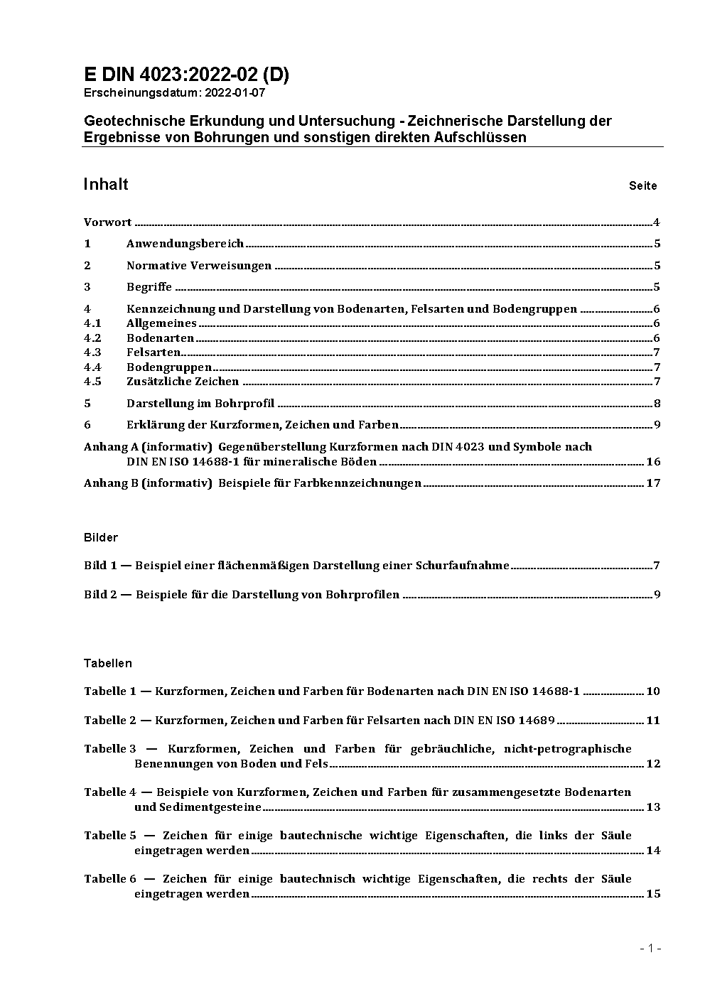 This standards applies to the graphical representation of boreholes, trial pits, shafts and headings according to DIN EN ISO 22475-1.
