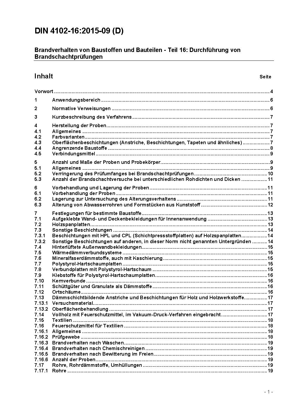 DIN 4102-16 describes the uniform procedure for testing building materials in the 'Brandschacht' according to DIN 4102-15. The revision of DIN 4102-16 is carried out in order to update the list of standardised products that are used in the test method. The test method is used for the fire testing of building materials. The Brandschacht is a square housing into which air at a constant flow rate is introduced from below, and from which flue gas escapes from above. It is equipped with a square gas burner by means of which the specimen arranged in a mounting frame so as to form a flue, are exposed to flaming.