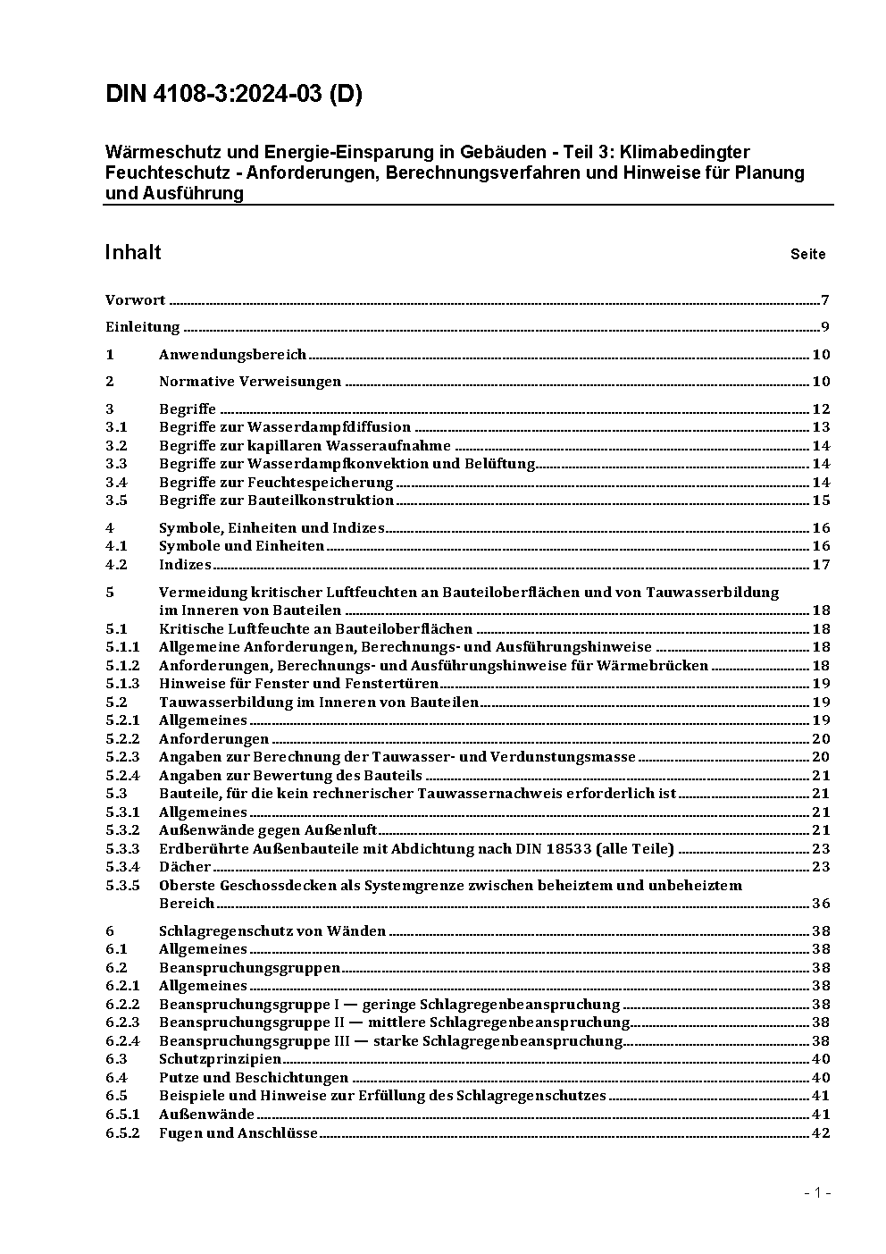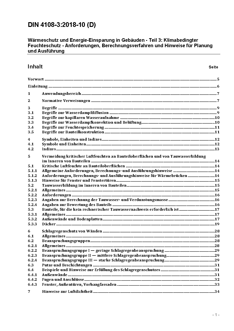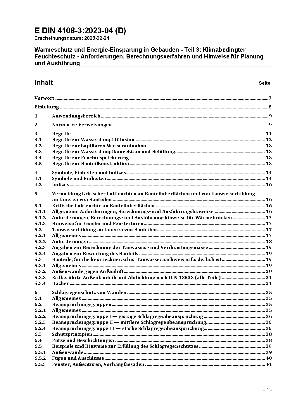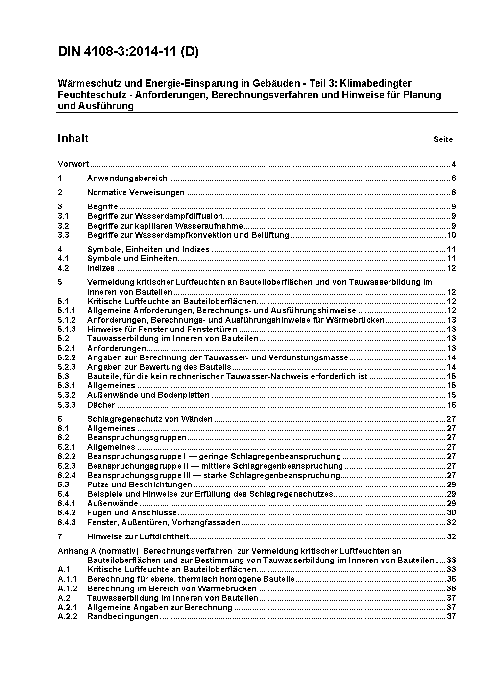 The standard specifies hygrothermal requirements and instructions for planning and performance of buildings and building components. It defines hygrothermal physical quantities and specifies requirements to protection against surface condensation (external and internal surface condensation), protection against driving rain (stressing groups and a map showing the driving rain stressing areas in Germany). It gives examples for calculation and a list of former hygrothermal physical quantities due to be replaced by standardized European and internatonal symbols.