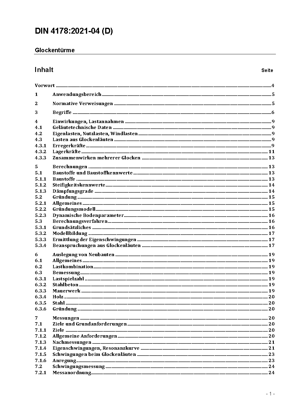 This standard applies to the construction, rebuilding and reconstruction of belltowers as well as to existing buildings, where the chime shall be changed. The standard contains calculation principles for the verification of stability as well as guidelines for the constructional design of belltowers