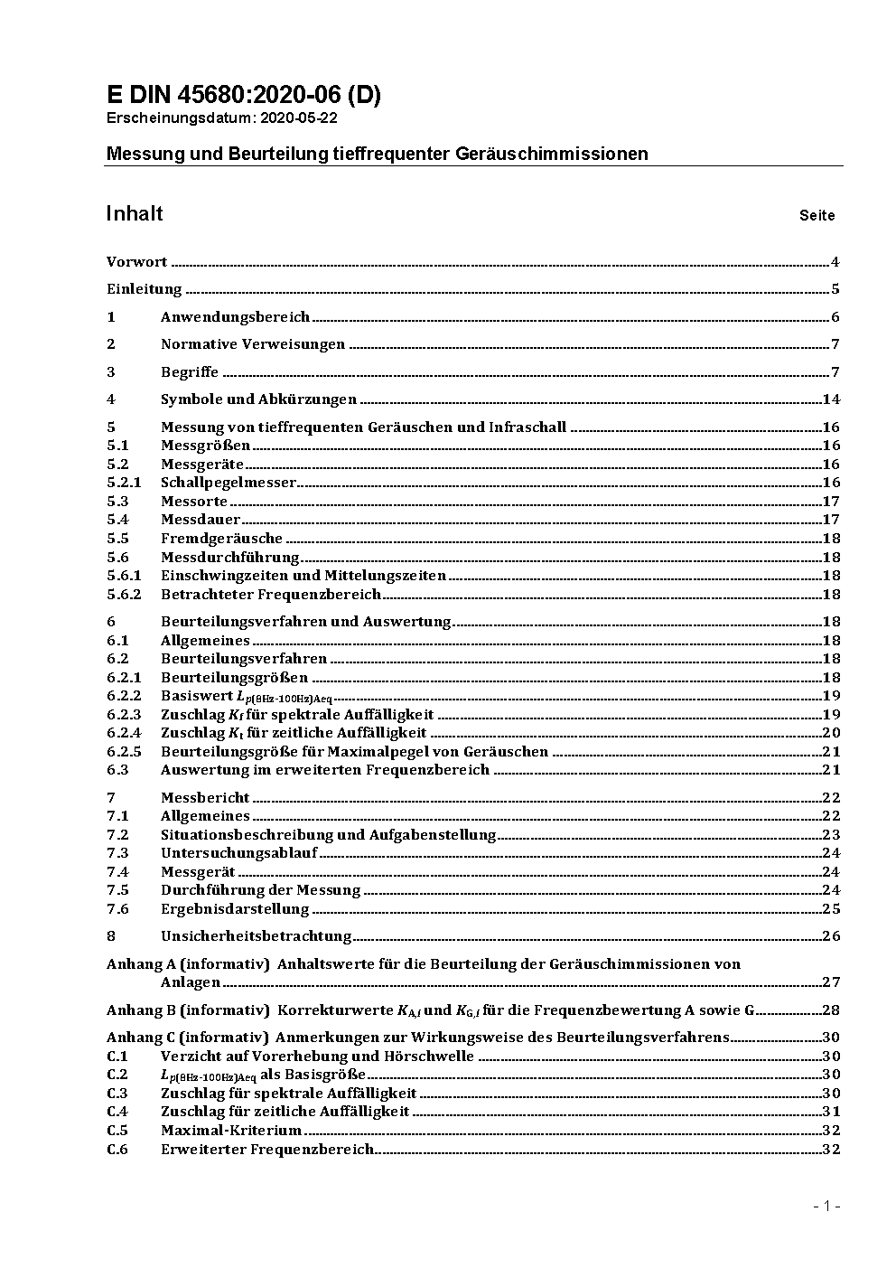 This document describes a method for the measurement and assessment of low-frequency noise immissions inside of buildings caused by airborne and/or structure-borne sound transmission. It should complete the existing methods for the measurement and assessment of noise and should serve for the assessment of low-frequency noise immissions for the protection against considerable irritations.