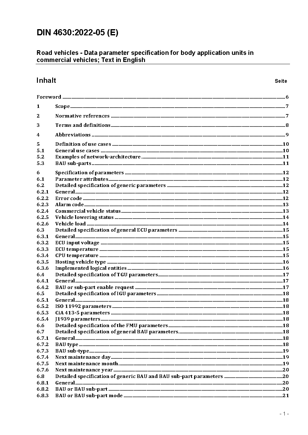 Road vehicles - Data parameter specification for body application units in commercial vehicles; Text in English
