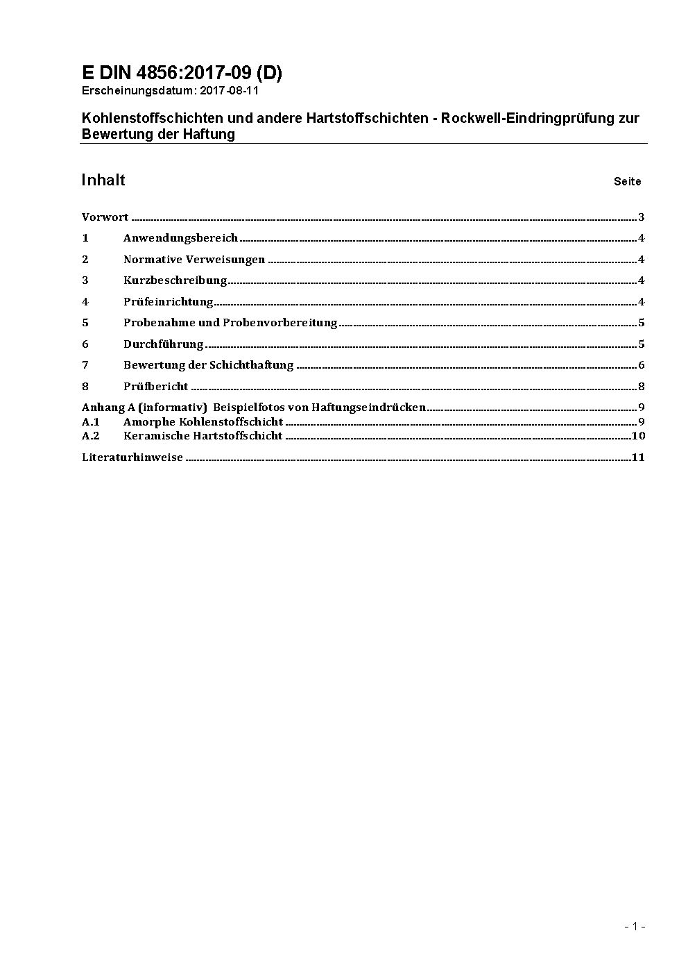 This standard specifies a method for the qualitative assessment of the adhesion of carbon layers with a thickness of up to 10 Mikrometer, in which an impression is produced with a diamond indenter used for the Rockwell hardness test.
