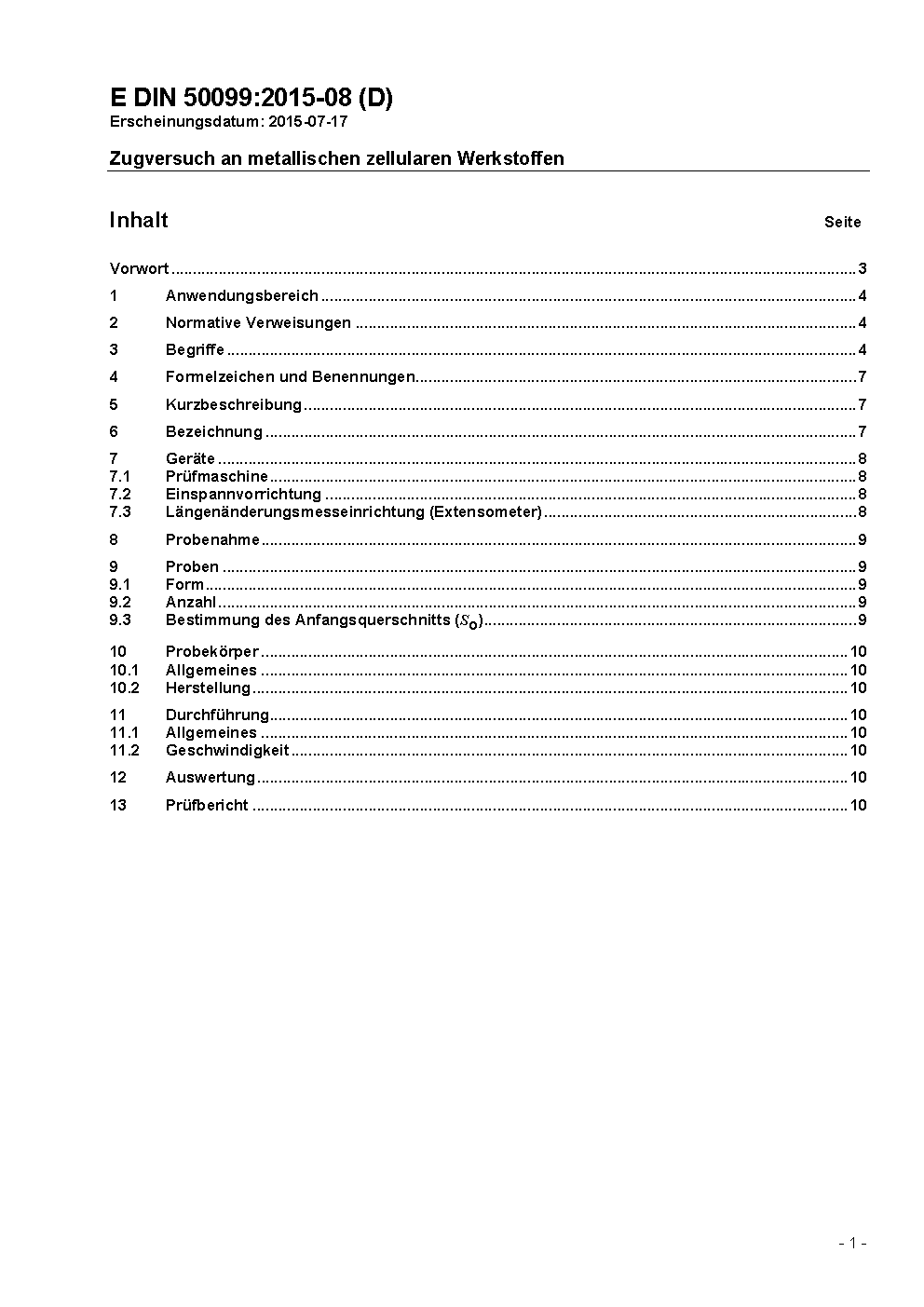 The standard specifies the strength characteristics and deformation behavior at the tensile test of metallic cellular materials.