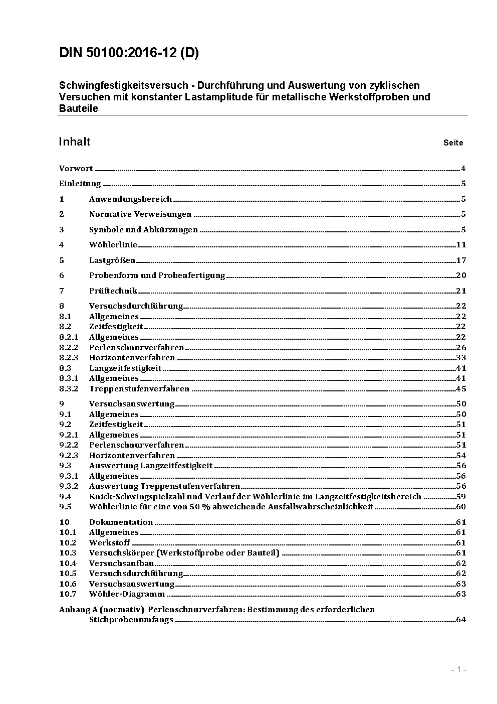 This standard specifies load controlled fatigue tests on metallic specimens or components that are used to determine fatigue properties for constant load amplitudes (S-N curve or Wöhler curve). The execution, evaluation and documentation of fatigue tests in the range of high cycle fatigue (HCF) and long life fatigue (LLF, former fatigue limit) are described. Strain and shear controlled tests in the range of low cycle fatigue (LCF) are not within the scope of this standard.