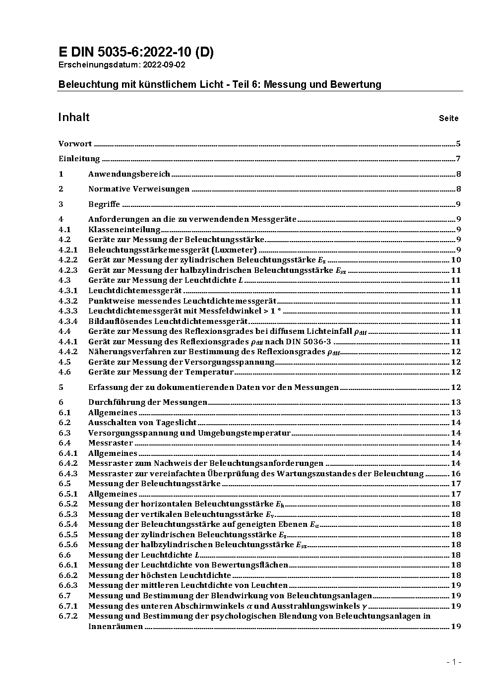 The standard covers the requirements for the measuring instruments to be used, the preparation, performance and the actual measurements, their evaluation and the way to present the results of the measurements in order to evaluate the artificial lighting of indoor and outdoor areas. Special regulations are given for the measurement and evaluation of the emergency lighting as well as of the integral lighting of machines.