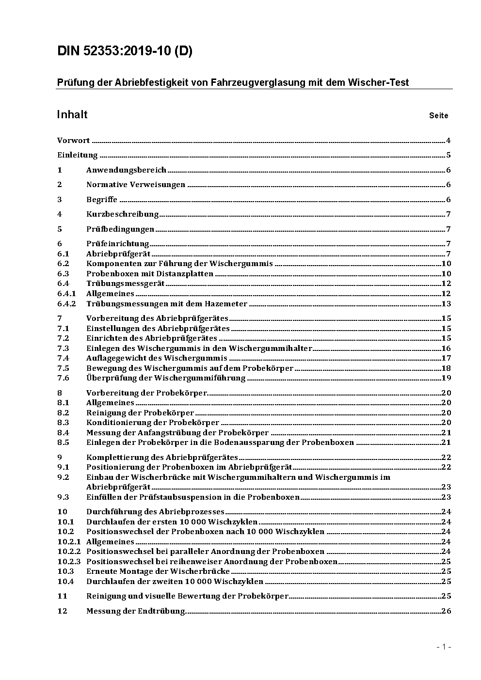 The surfaces of vehicle glazing are usually subject to abrasive wear. This is caused by different mechanisms, for example the impact of small particles (e. g. sand), the application of washing brushes, window wipers or ice scrapers, or in case of movable windows operation with dirt attached. In order to assess the abrasion resistance of glazing surfaces with regard to these different mechanisms occurring in practice, corresponding different test procedures are required. In addition to the abrasive-wheel procedure (Taber Test) used for many years in abrasion testing of vehicle glazing, the sand-drop test and the newer car-wash test, a procedure shall be standardized which simulates the abrasion caused by the window wipers. This is significant especially for the assessment of windscreens but also for other panes.