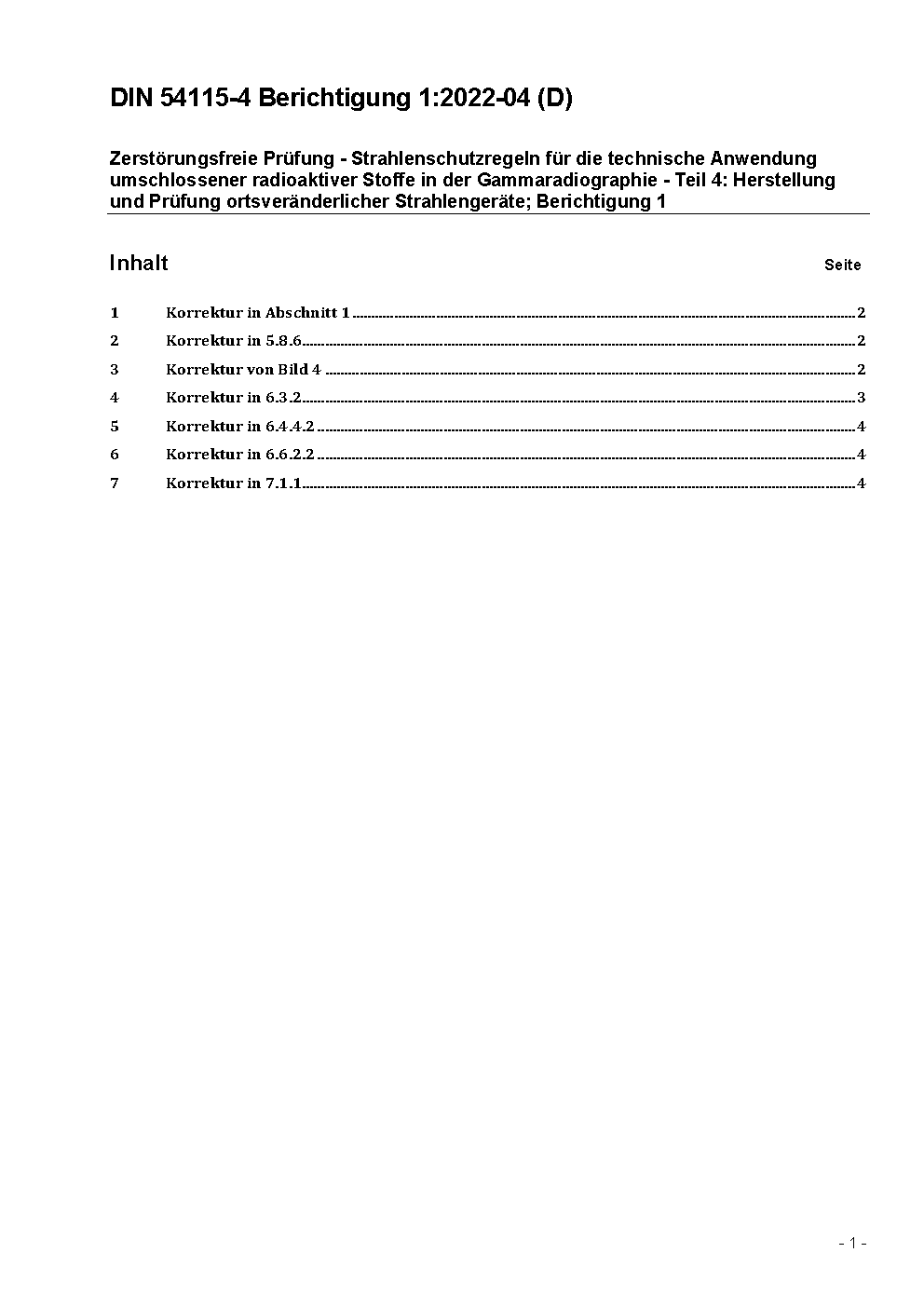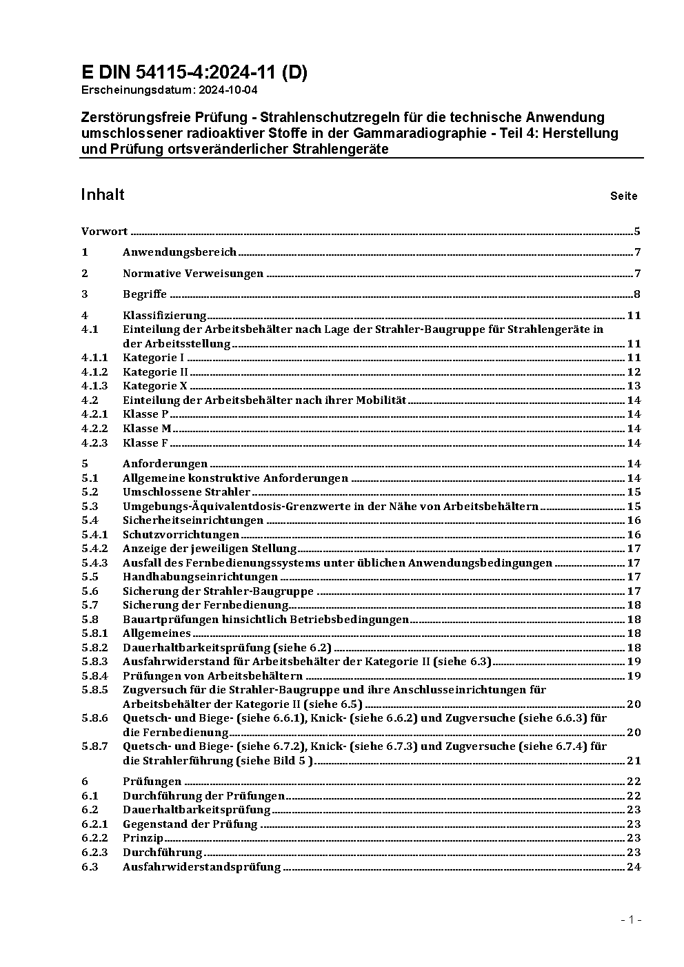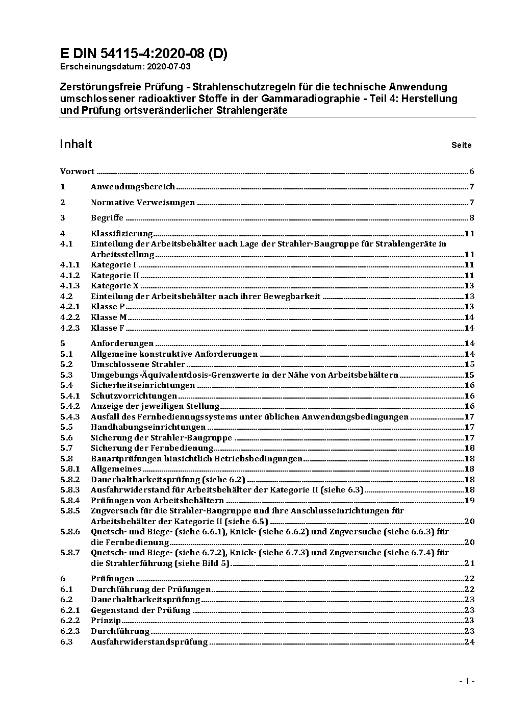 Zerstörungsfreie Prüfung - Strahlenschutzregeln für die technische Anwendung umschlossener radioaktiver Stoffe in der Gammaradiographie - Teil 4: Herstellung und Prüfung ortsveränderlicher Strahlengeräte / Achtung: Daneben gilt DIN 54115-4 (2021-03) noch bis 2026-08-31.