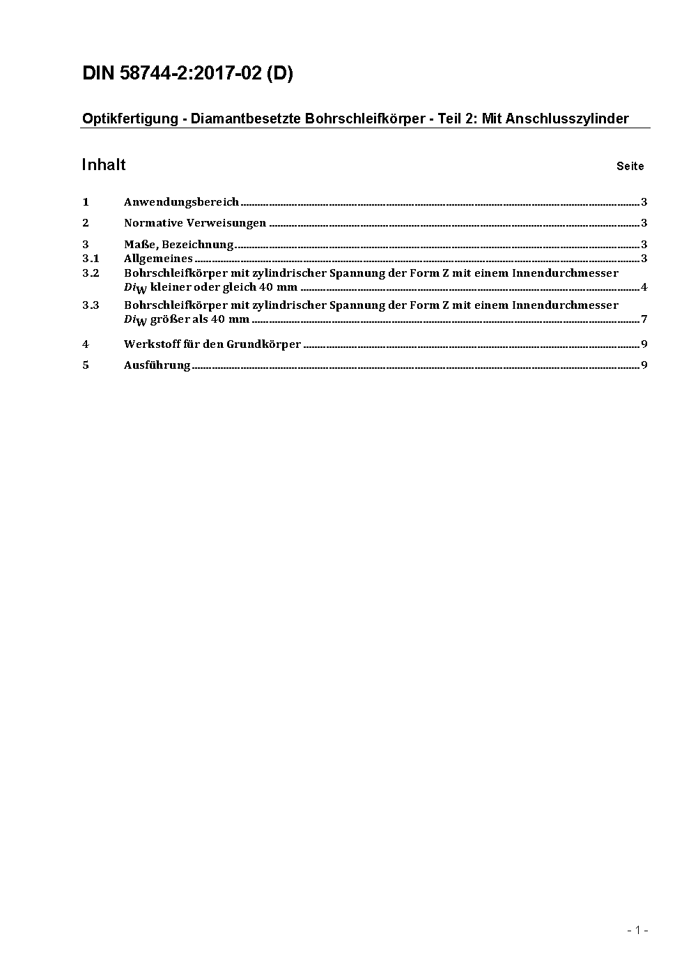 The document contains standardized dimensions for diamond impregnated core drills with fitting cylinders which are used for production in optical engineering.