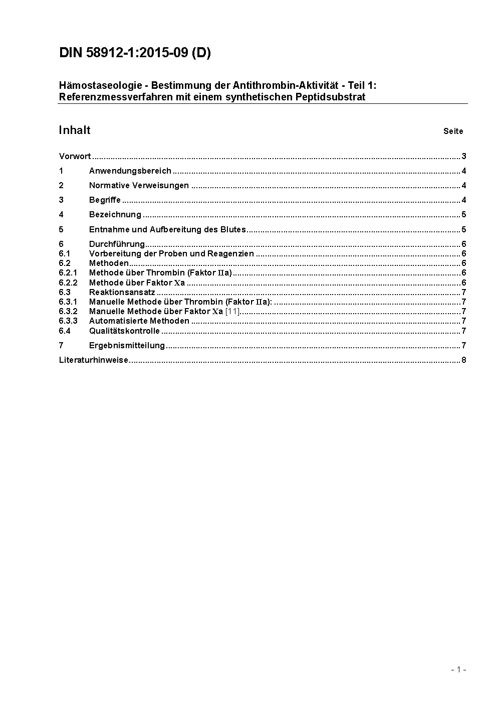 This standard is applicable to the functional determination of the antithrombin activity (former known as Antithrombin III [AT III])as heparin cofactor activity with regard to thrombin. The purpose of this standard is to establish comparable results of the antithrombin activity of a sample. This determination is mainly used in the diagnosis of thrombophilic diathesis as well as for the monitoring of a substitution therapy and for the determination of the activity in antithrombin concentrates.