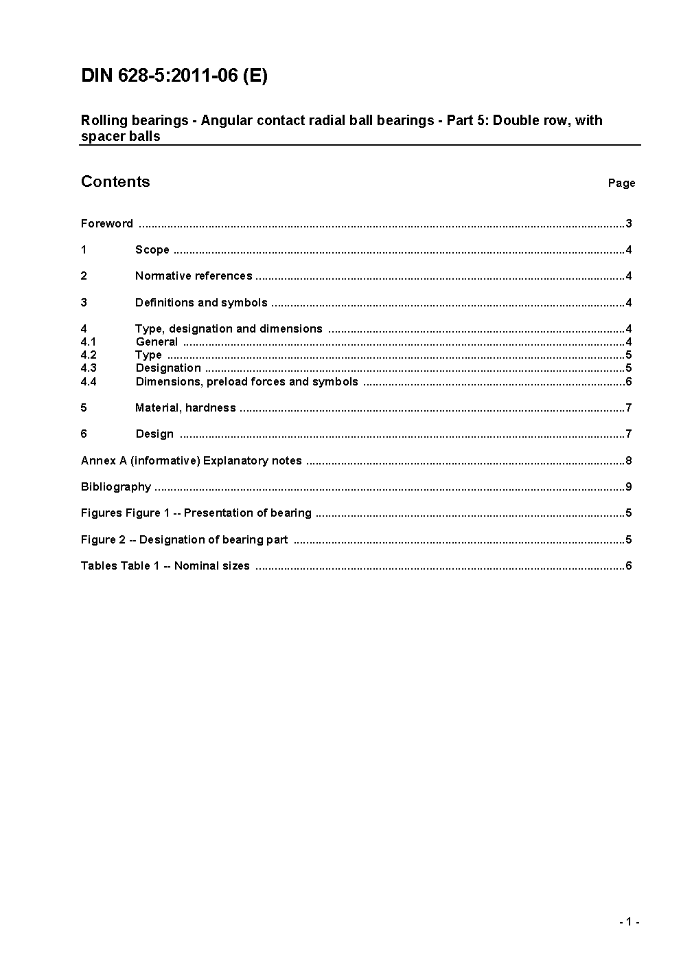 This document specifies the dimensions, preload forces and the designations for double-row angular contact ball bearings without filling slots and with spacers. In consideration of the general plan of boundary dimensions stated in DIN 616 it offers an adjusted selection of angular contact ball bearings of this construction for the practical requirements of the user.