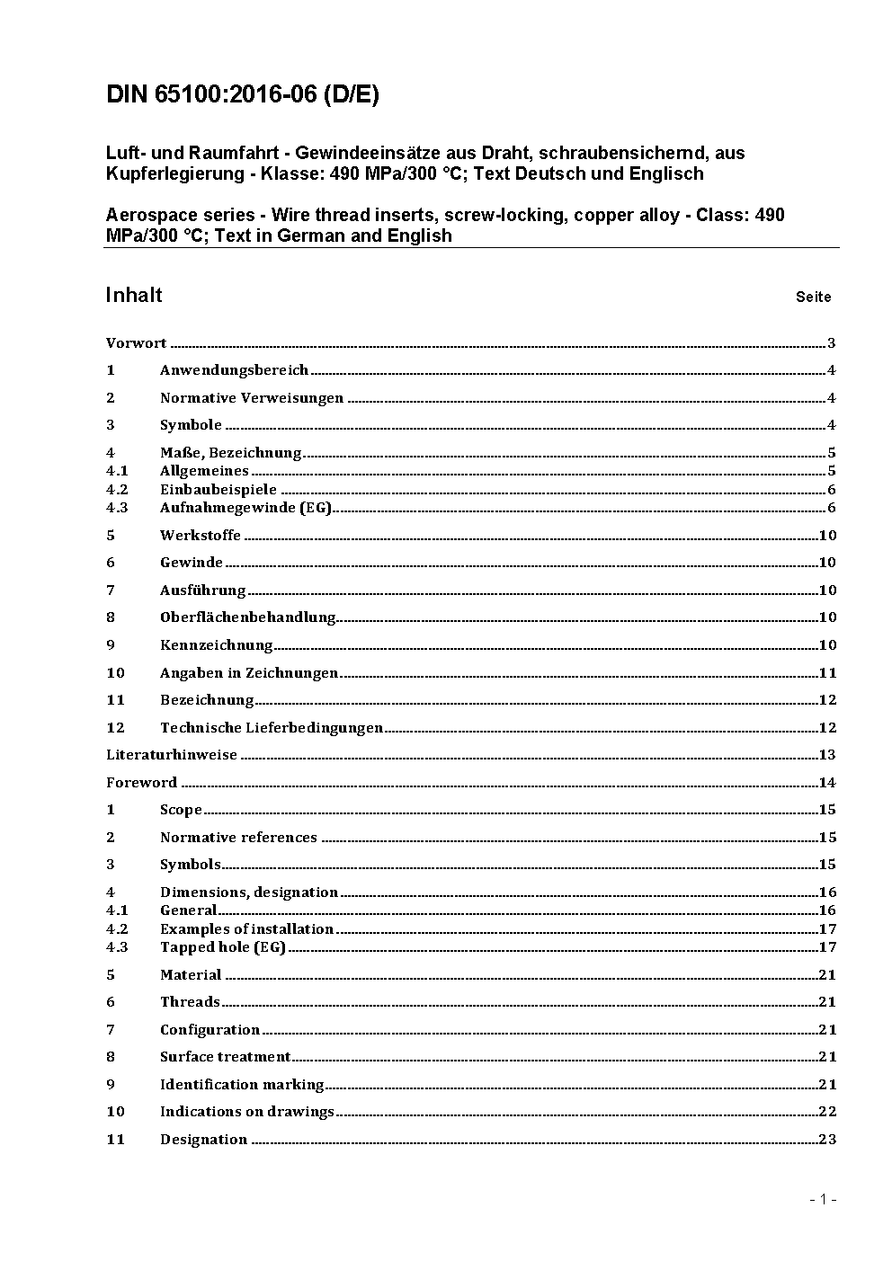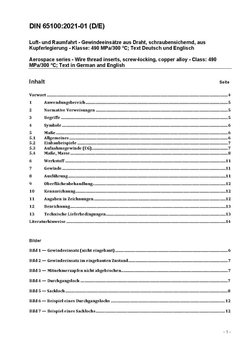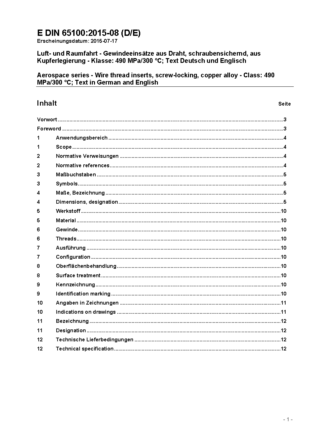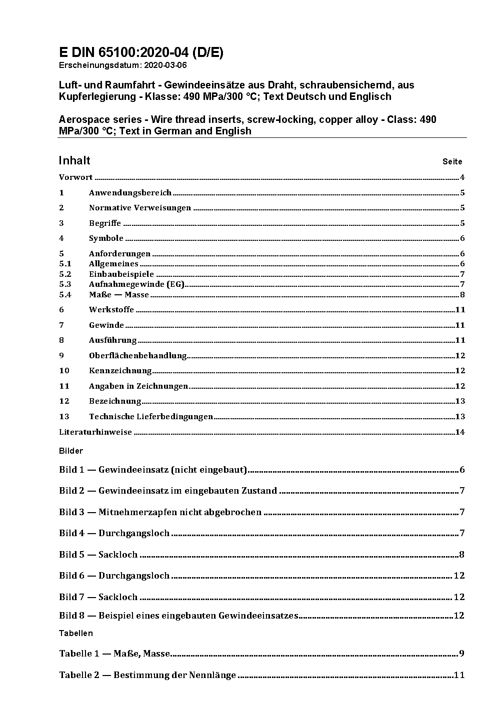 Luft- und Raumfahrt - Gewindeeinsätze aus Draht, schraubensichernd, aus Kupferlegierung - Klasse: 490 MPa/300 °C; Text Deutsch und Englisch