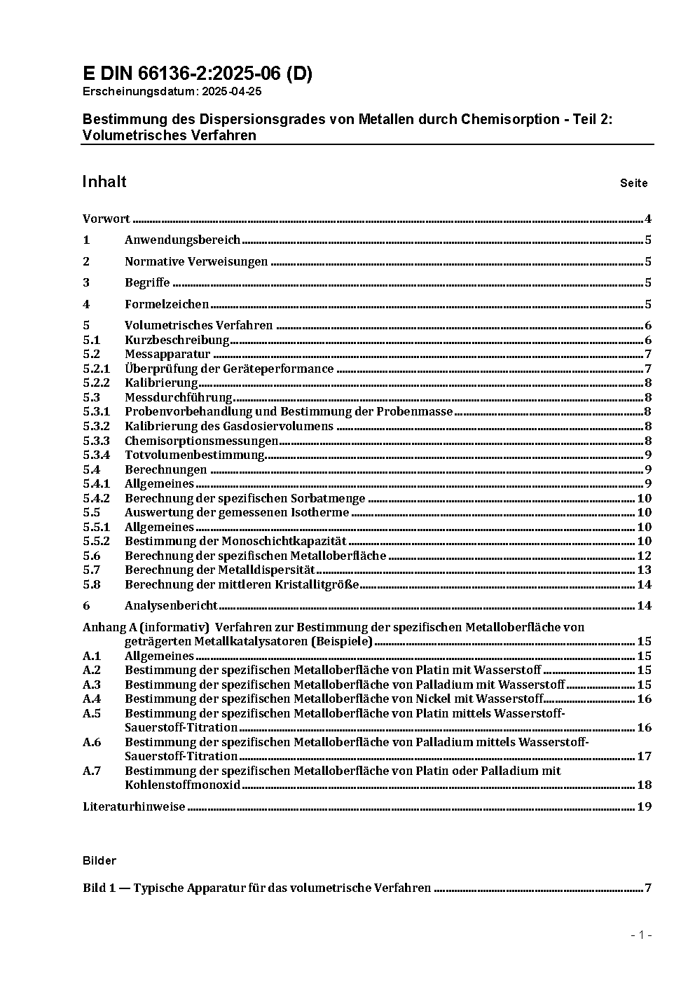 This standard applies to the determination of the specific metal surface using chemisorption. Different practical variants of the volumetric method are described for the determination of the chemisorbed gasvolume on the metals platinum, nickel and palladium with the adsorptives hydrogen, oxigen and carbon monoxide.
