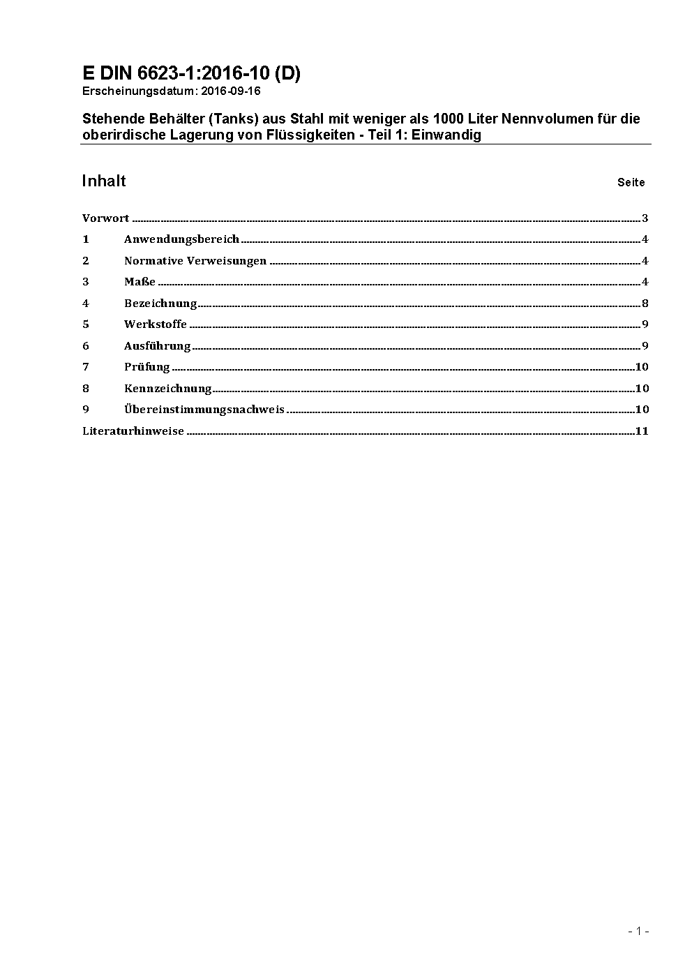 This draft standard is applicable to single wall vertical steel tanks for the above ground storage of flammable and not flammable liquids hazardous and not hazardous for water, which compatibility with the tank material is proven according to DIN 6601. The tanks are suitable for the storage of liquids not exceeding a density of 1,9 kg/l. The tanks may be operated with an internal overpressure not exceeding 50 kPa (0,5 bar) and an internal negative pressure not exceeding 5 kPa (0,05 bar). Loads resulting from earthquakes and flooding are not considered in this draft standard.