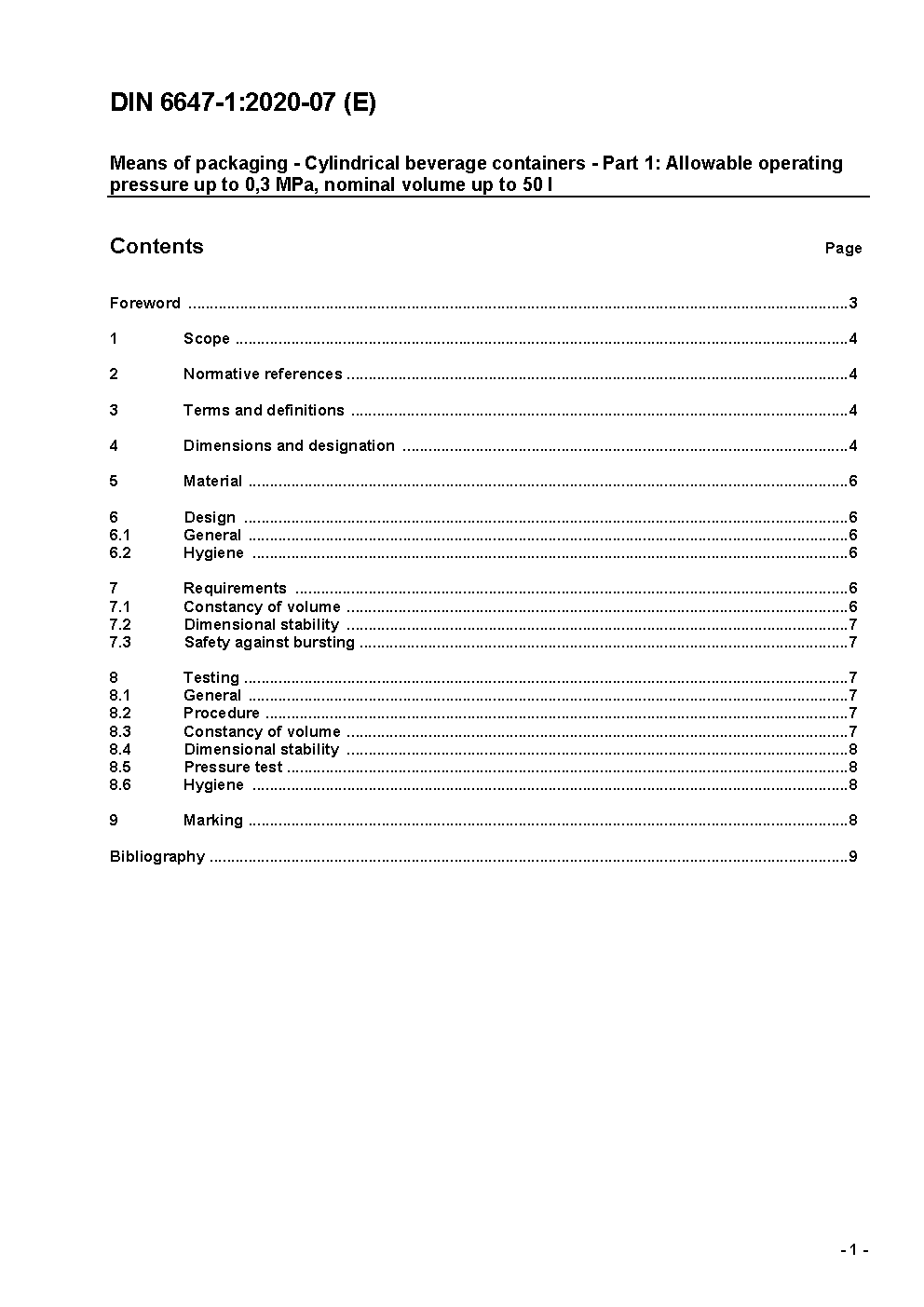 Means of packaging - Cylindrical beverage containers - Part 1: Allowable operating pressure up to 3 bar, nominal volume up to 50 litres.