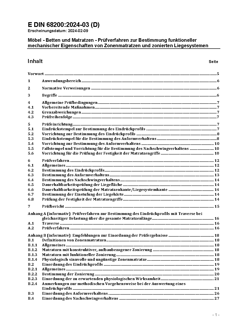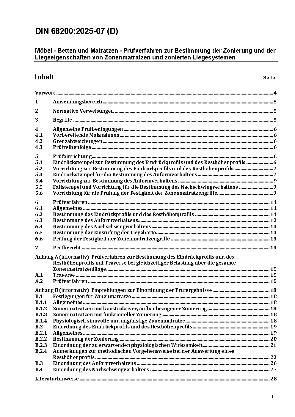 Möbel - Betten und Matratzen - Prüfverfahren zur Bestimmung der Zonierung und der Liegeeigenschaften von Zonenmatratzen und zonierten Liegesystemen