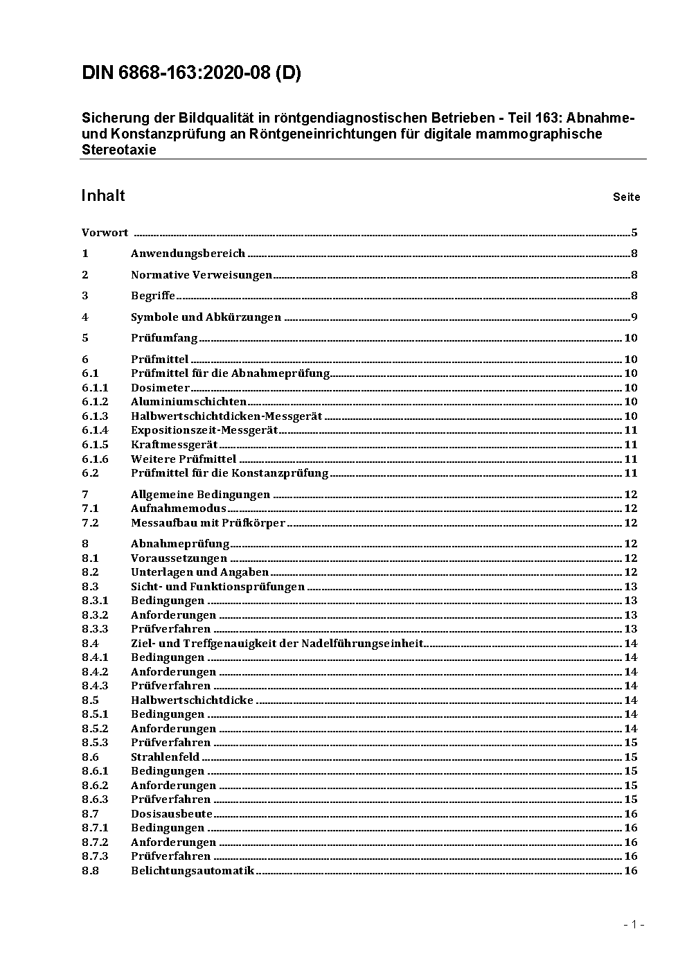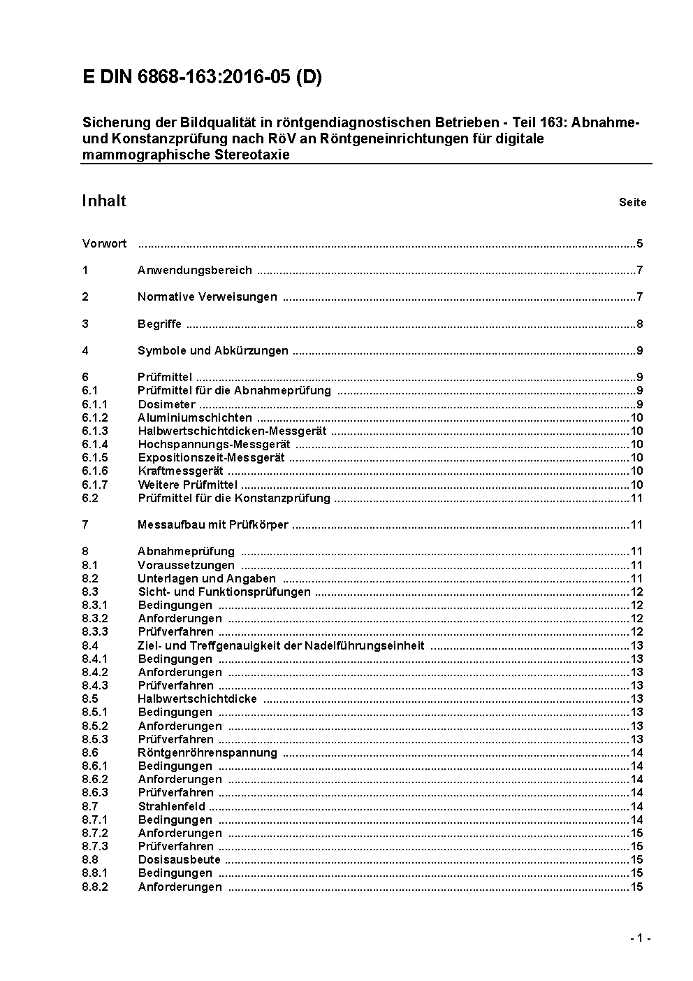 The standard describes the acceptance and constancy test procedure for digital mammographic stereotactic installations according to German X-ray ordinance (RöV).