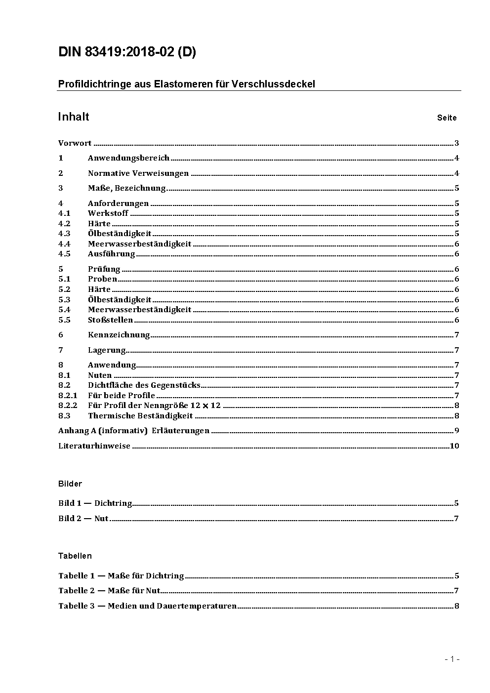 This standard specifies gaskets of trapezoidal cross-section for hinged or bolted covers. These gaskets are inserted in dovetail grooves in the covers. Depending on the breadth of the sealing surface of the counterpart, two profiles are prescribed. The values for the diameters of the gaskets are to be chosen in accordance with the dimensions of the covers. The requirements concerning oil and seewater resistance take account if their application on ships.